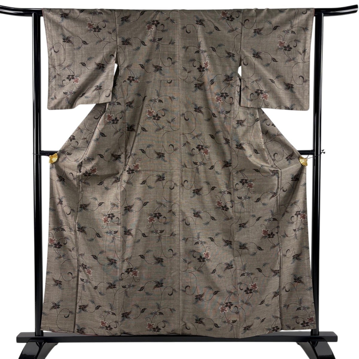 【美品】 紬 身丈163cm 裄丈64.5cm M 袷 花唐草 焦茶色 正絹 秀品