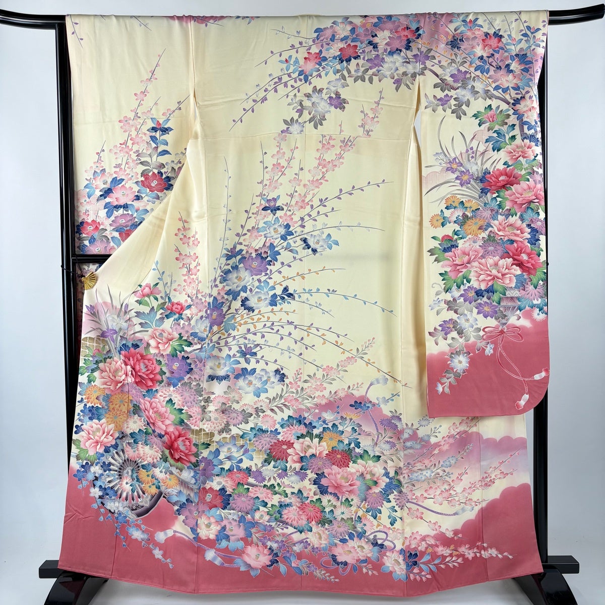 【美品】 振袖 身丈163cm 裄丈66cm M 袷 花車 牡丹 銀彩 染め分け クリーム 正絹 秀品