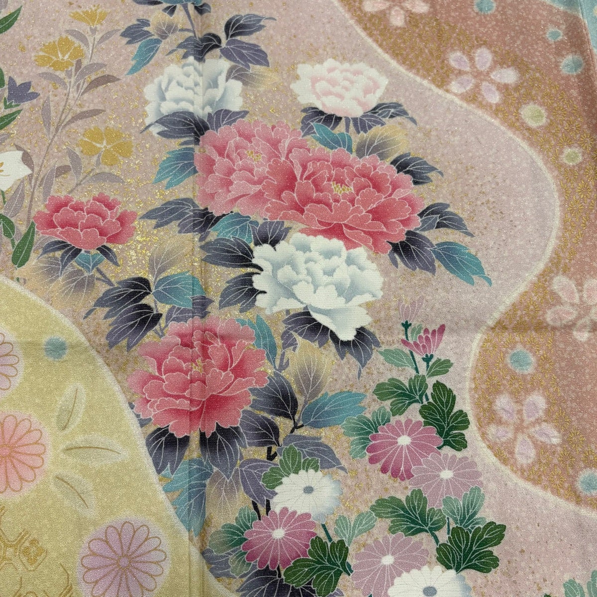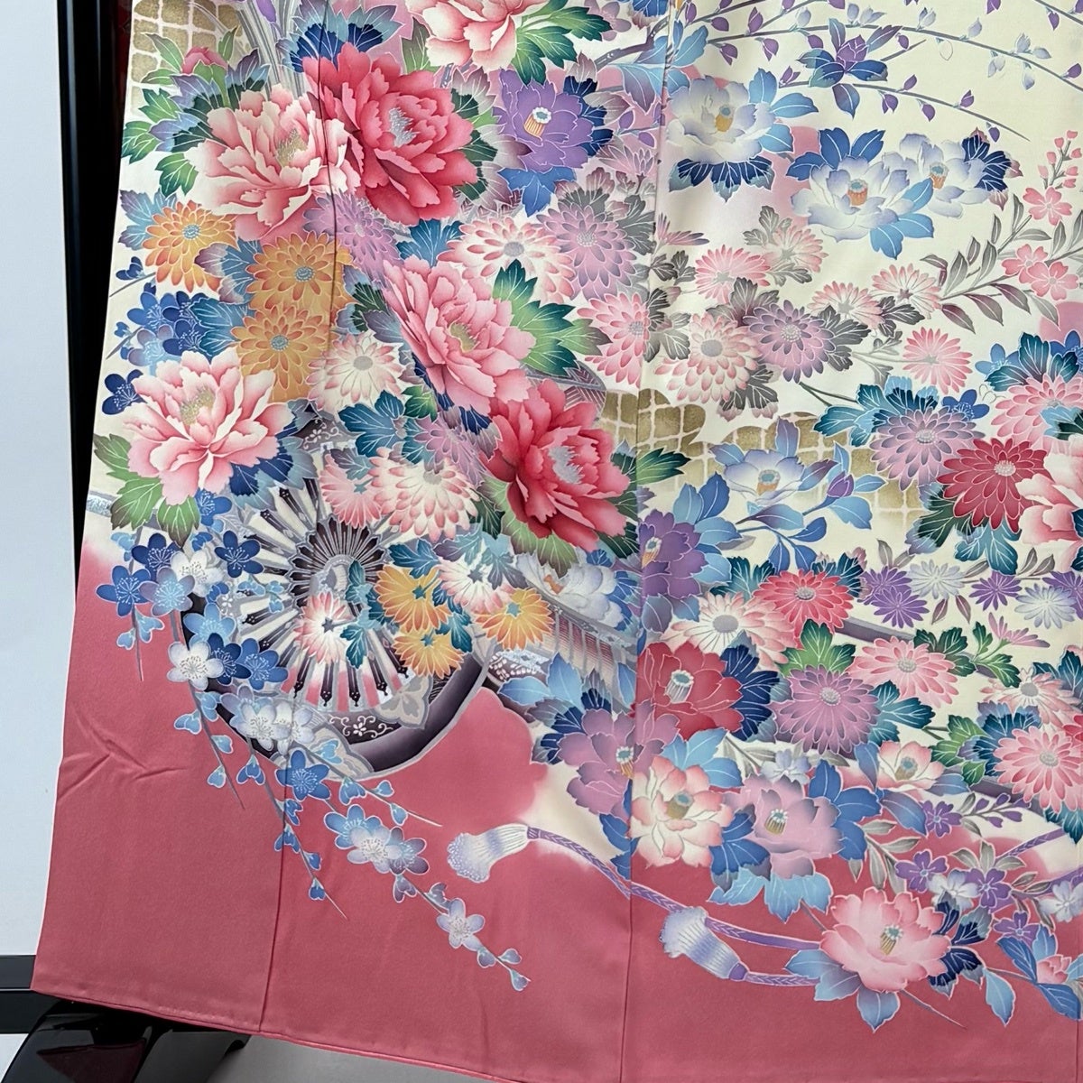 振袖 身丈157cm 裄丈62cm S 袷 檜扇 牡丹 金銀彩 ぼかし サーモンピンク 正絹 秀品