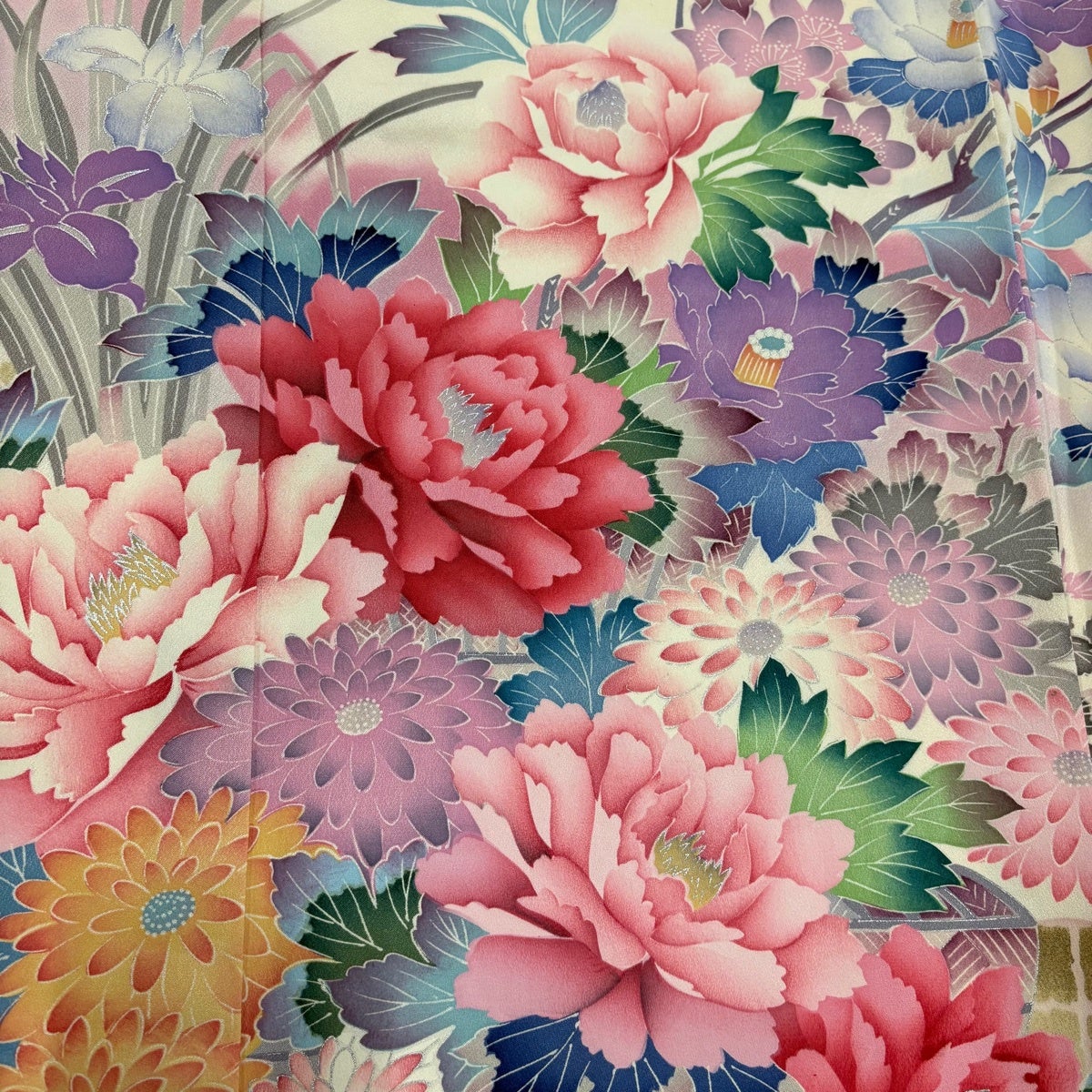 【美品】 振袖 身丈157.5cm 裄丈64cm M 袷 牡丹 桜 銀通し 刺繍 クリーム 正絹 逸品