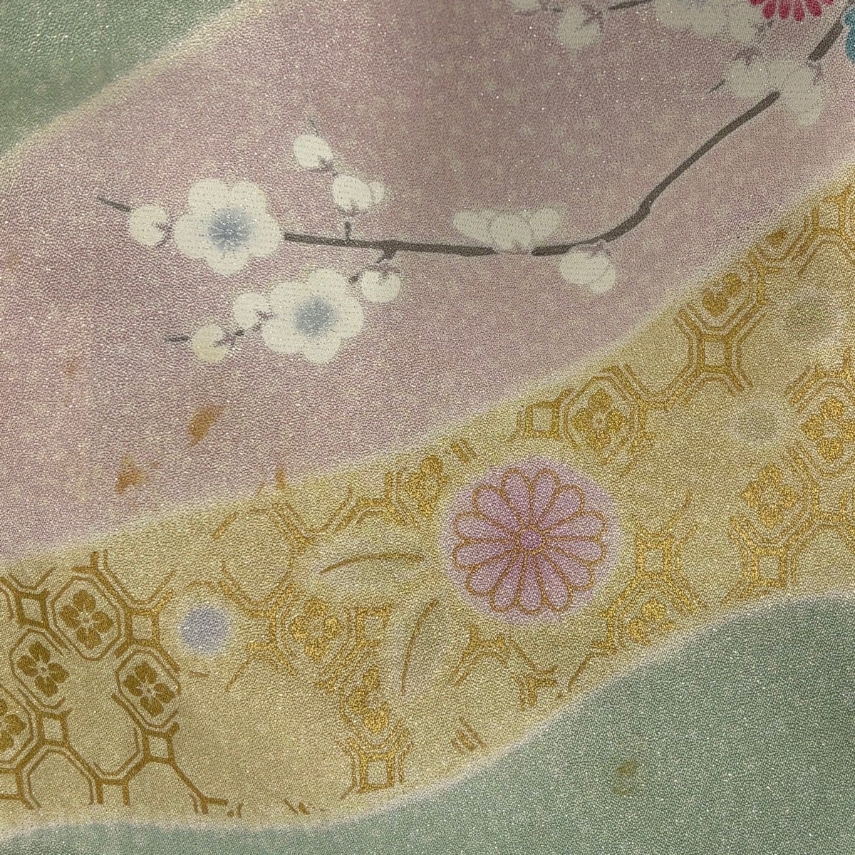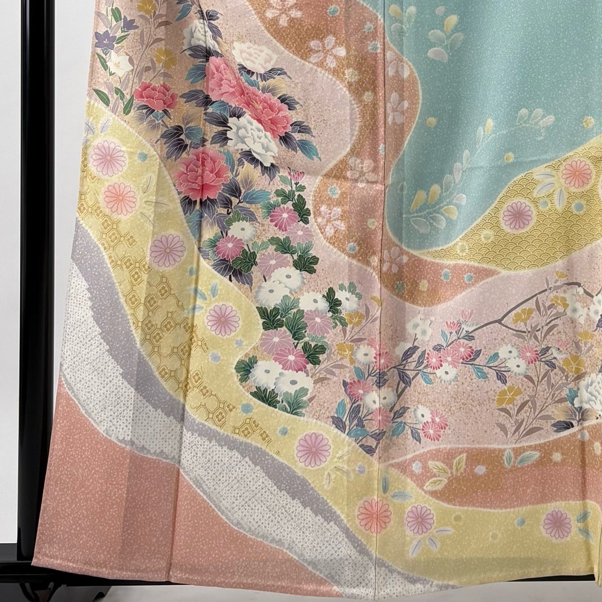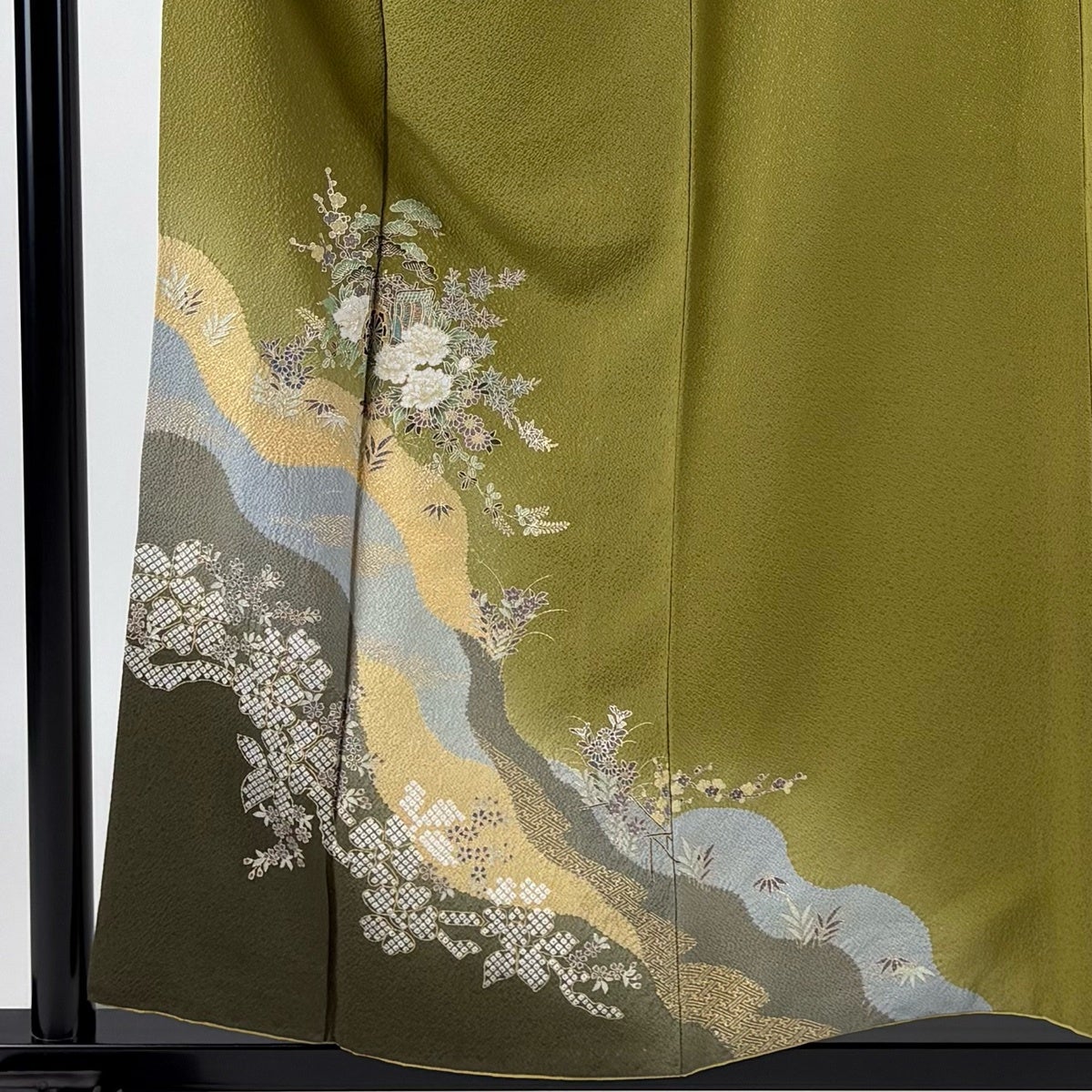 【在庫一掃】 訪問着 身丈154cm 裄丈64.5cm M 袷 牡丹 菊 金糸 金彩 薄緑 正絹 名品