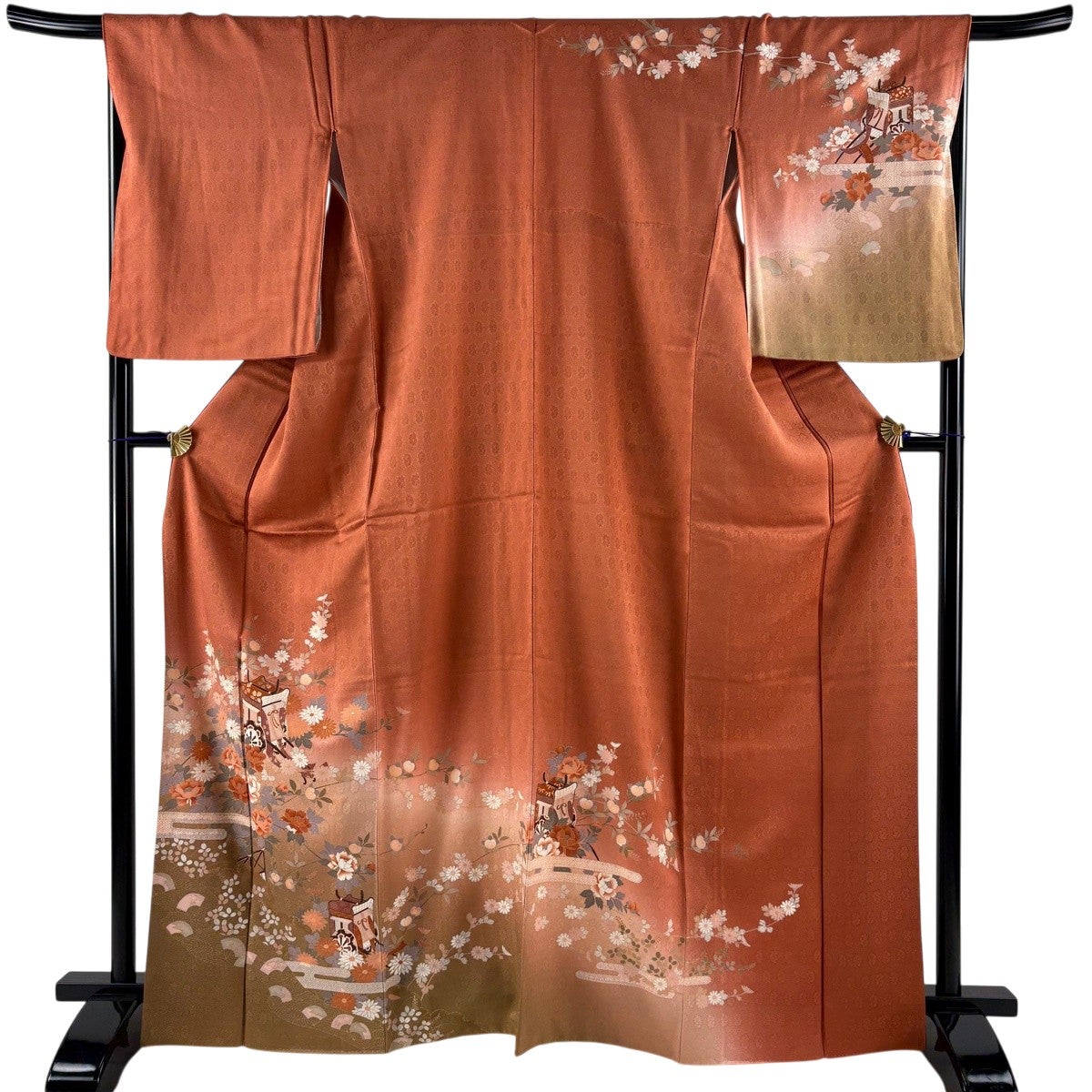 訪問着 身丈159cm 裄丈66.5cm M 袷 ますいわ屋 菊 牡丹 金糸 金彩 黄土色 正絹 名品