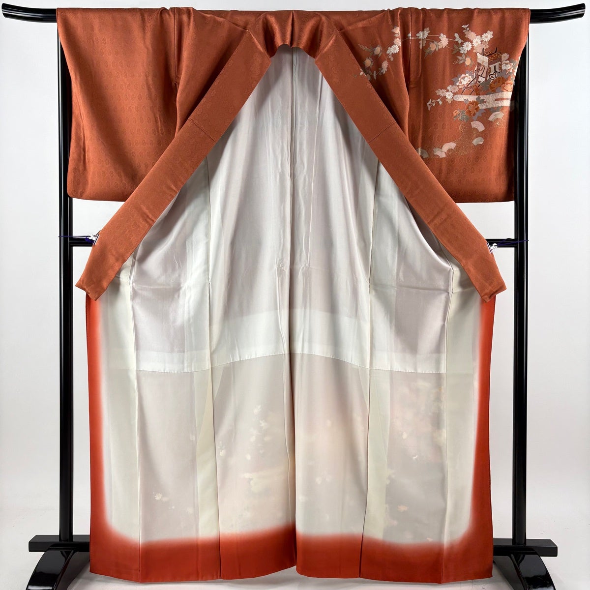 振袖 身丈161cm 裄丈64cm M 袷 袋帯フルセット 牡丹 山並み 染め分け 朱色 正絹 秀品