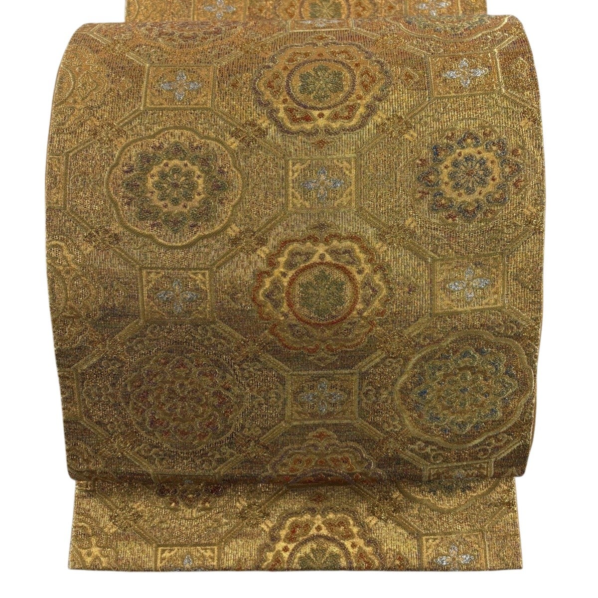 袋帯 名品 花丸文 唐草 金糸 唐織 灰緑 六通 正絹