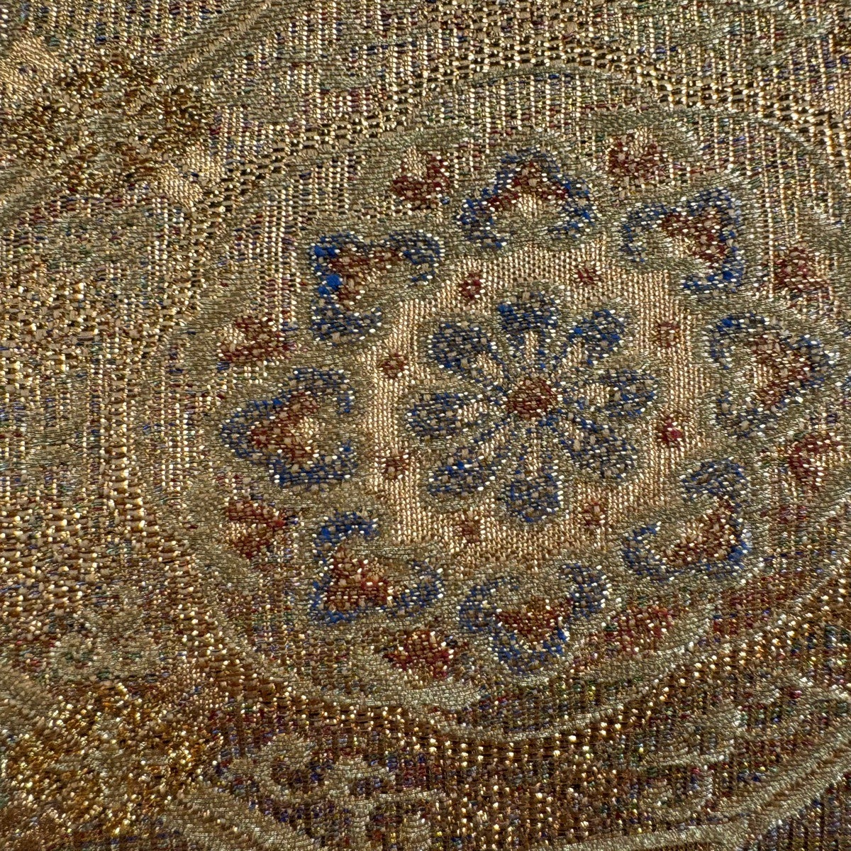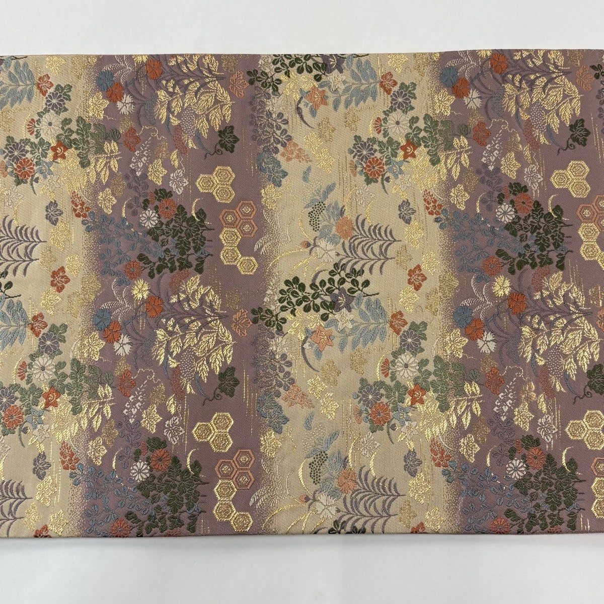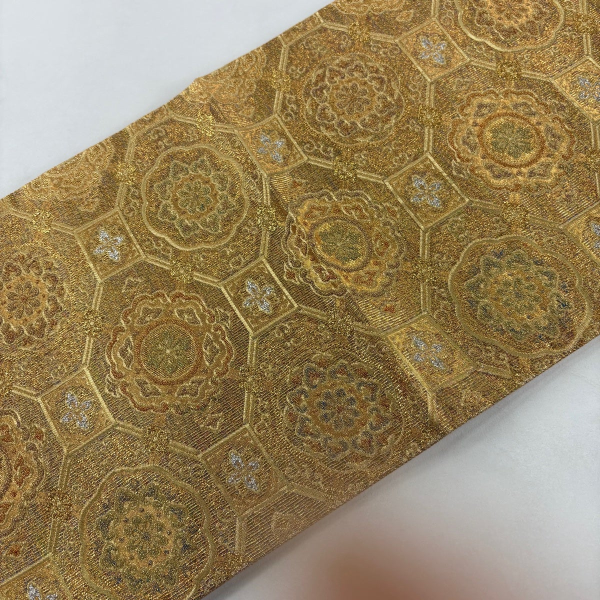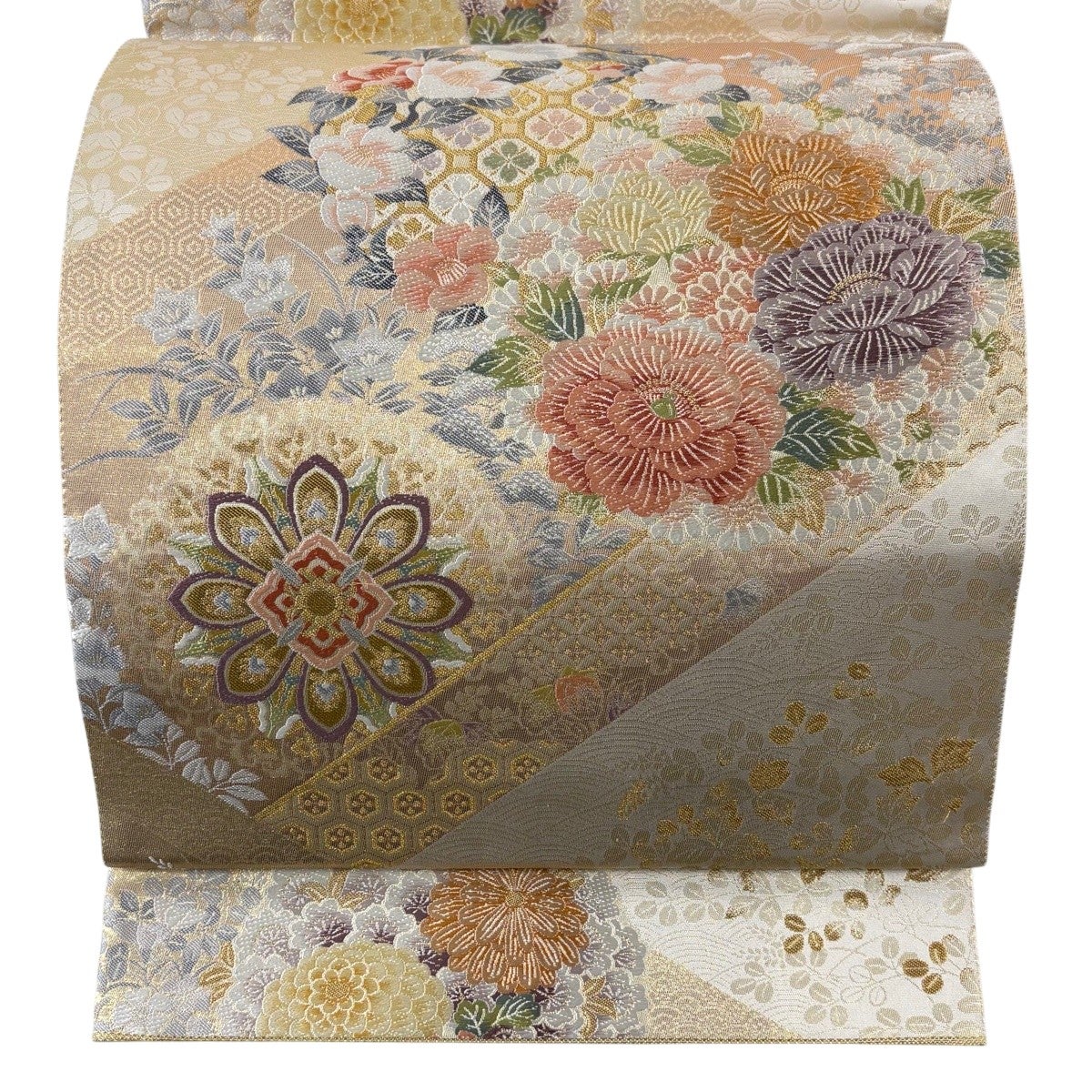 袋帯 名品 花丸文 亀甲 金彩 螺鈿 灰色 お太鼓柄 正絹