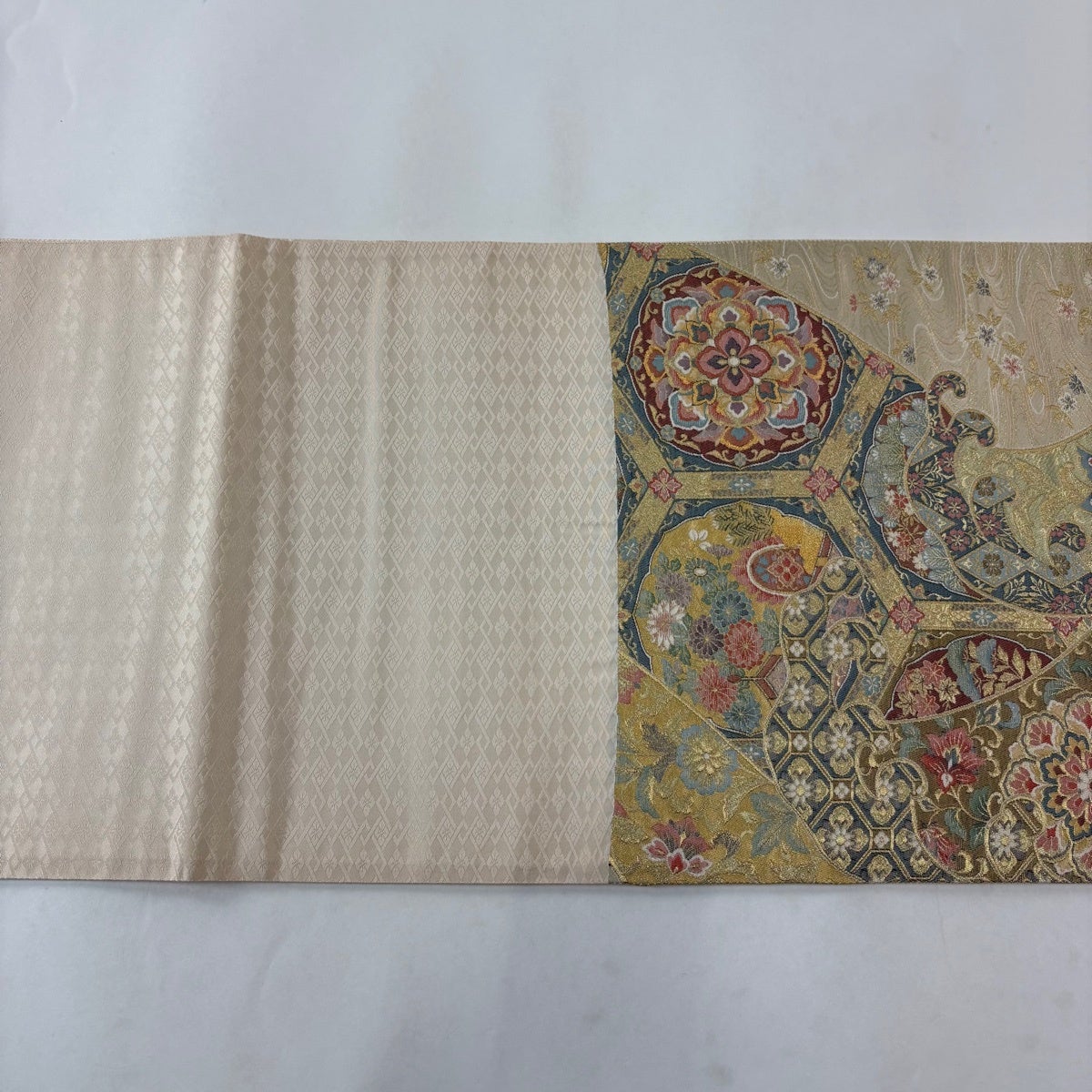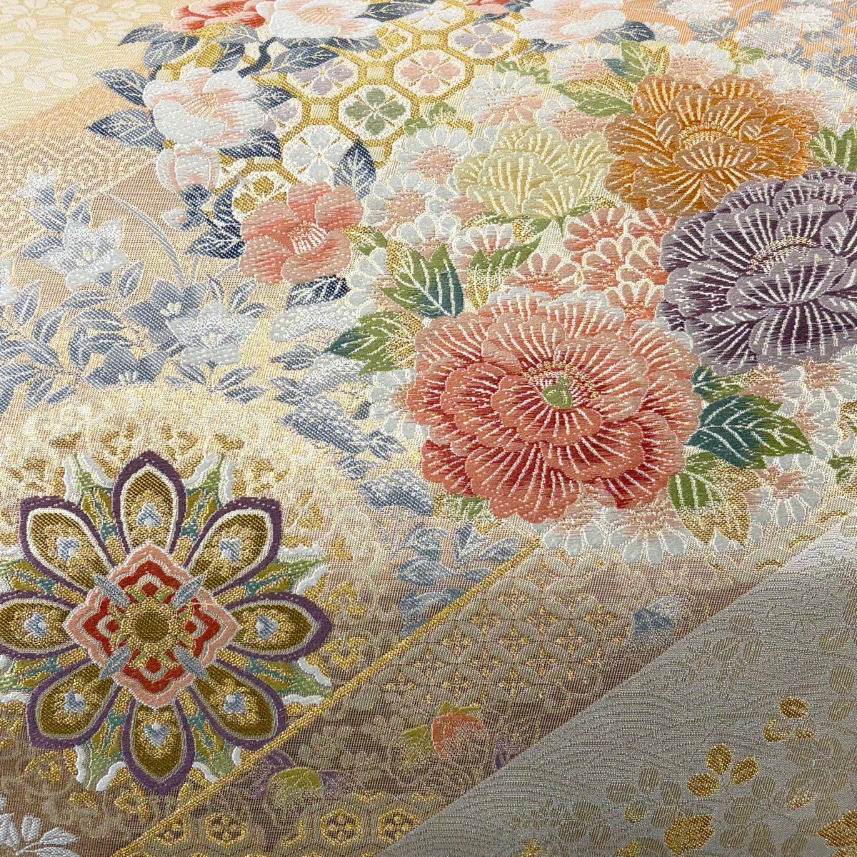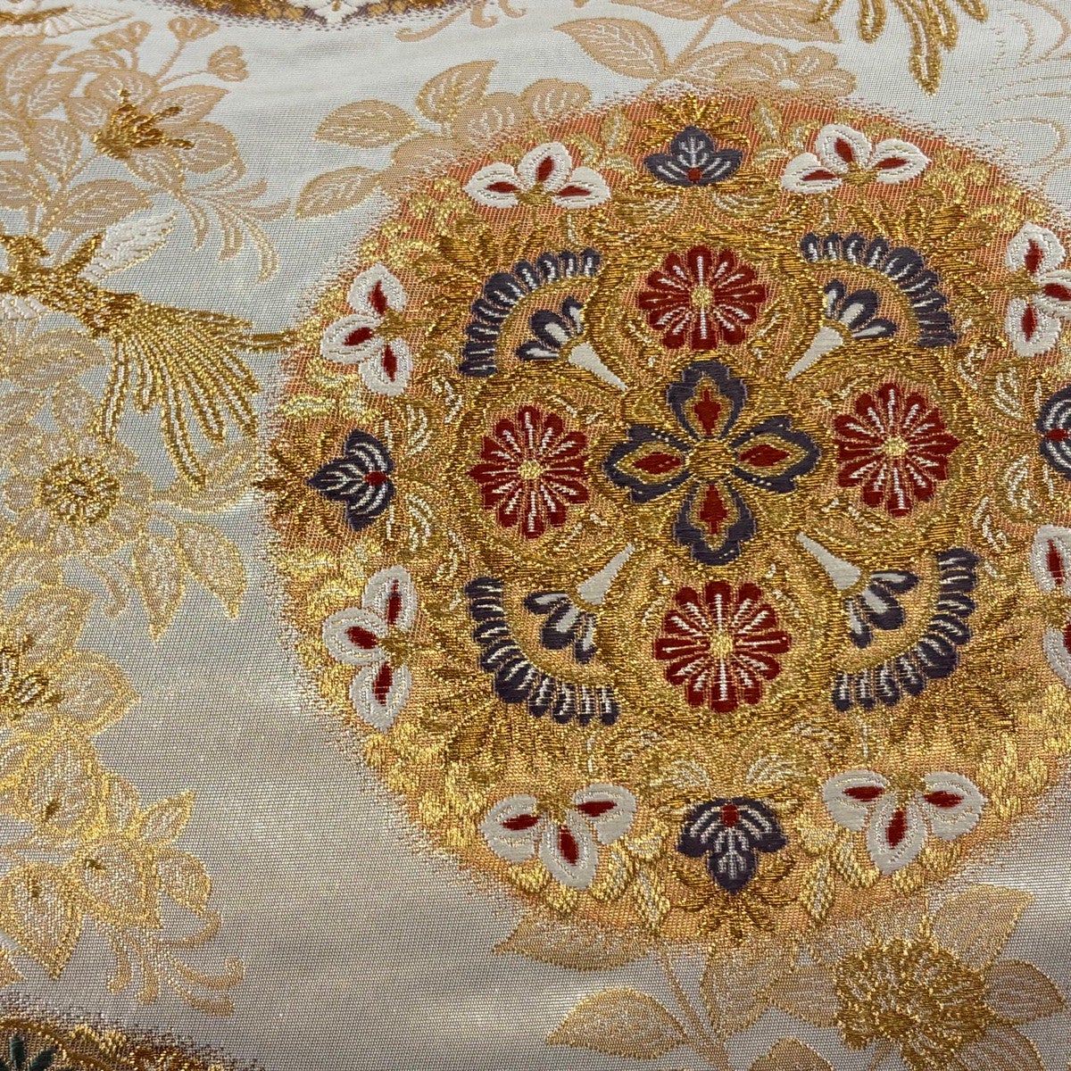 【美品】 袋帯 逸品 皇綾彩錦 華文 草花 唐織 金糸 クリーム 六通 正絹
