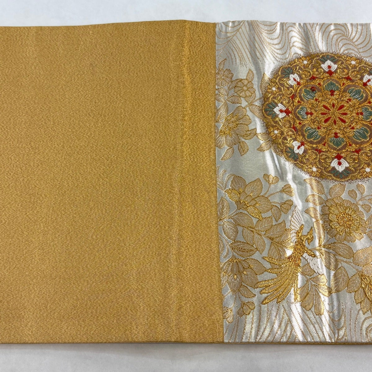 袋帯 名品 鈴乃屋 華文 鳳凰 金糸 箔 ベージュ 六通 正絹