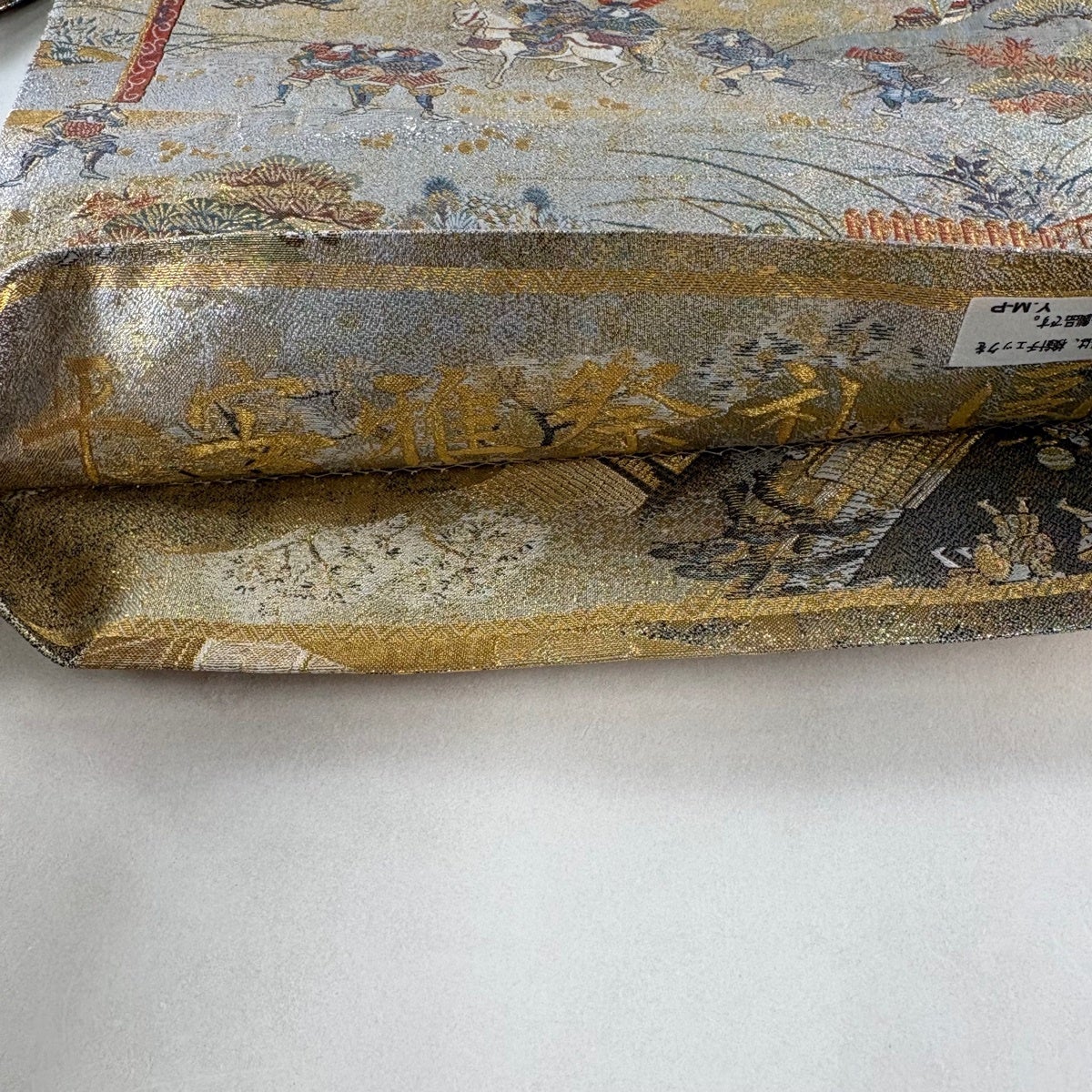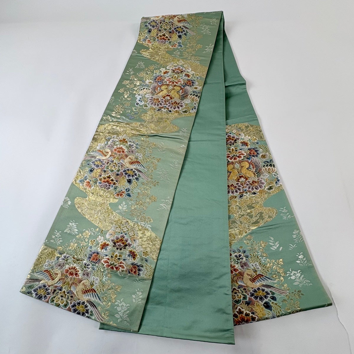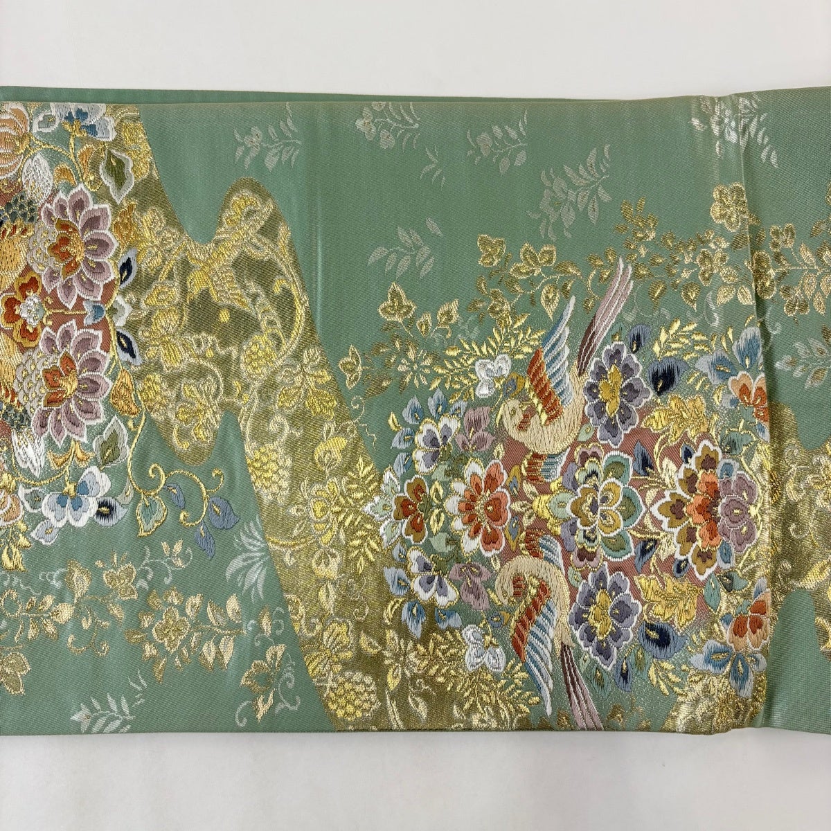 袋帯 逸品 龍村晋 落款あり 天平猟獣文錦 金糸 箔 薄緑 全通 正絹