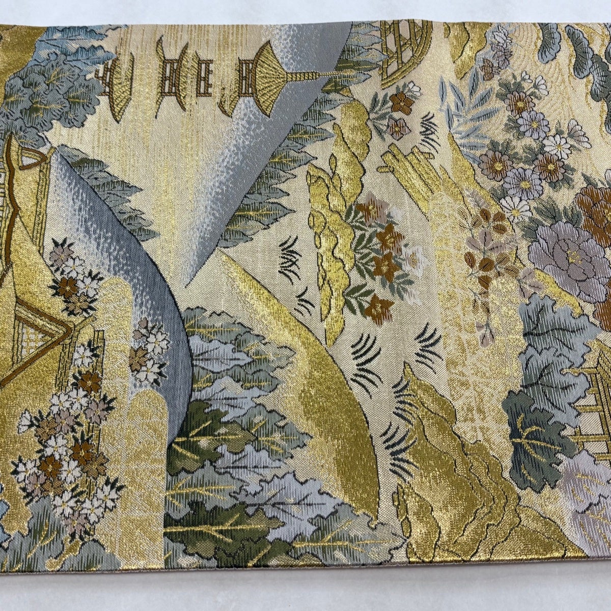 袋帯 逸品 山口美術織物 落款あり 春秋花映 桜楓 源氏香 唐織 金糸 灰緑 六通 正絹