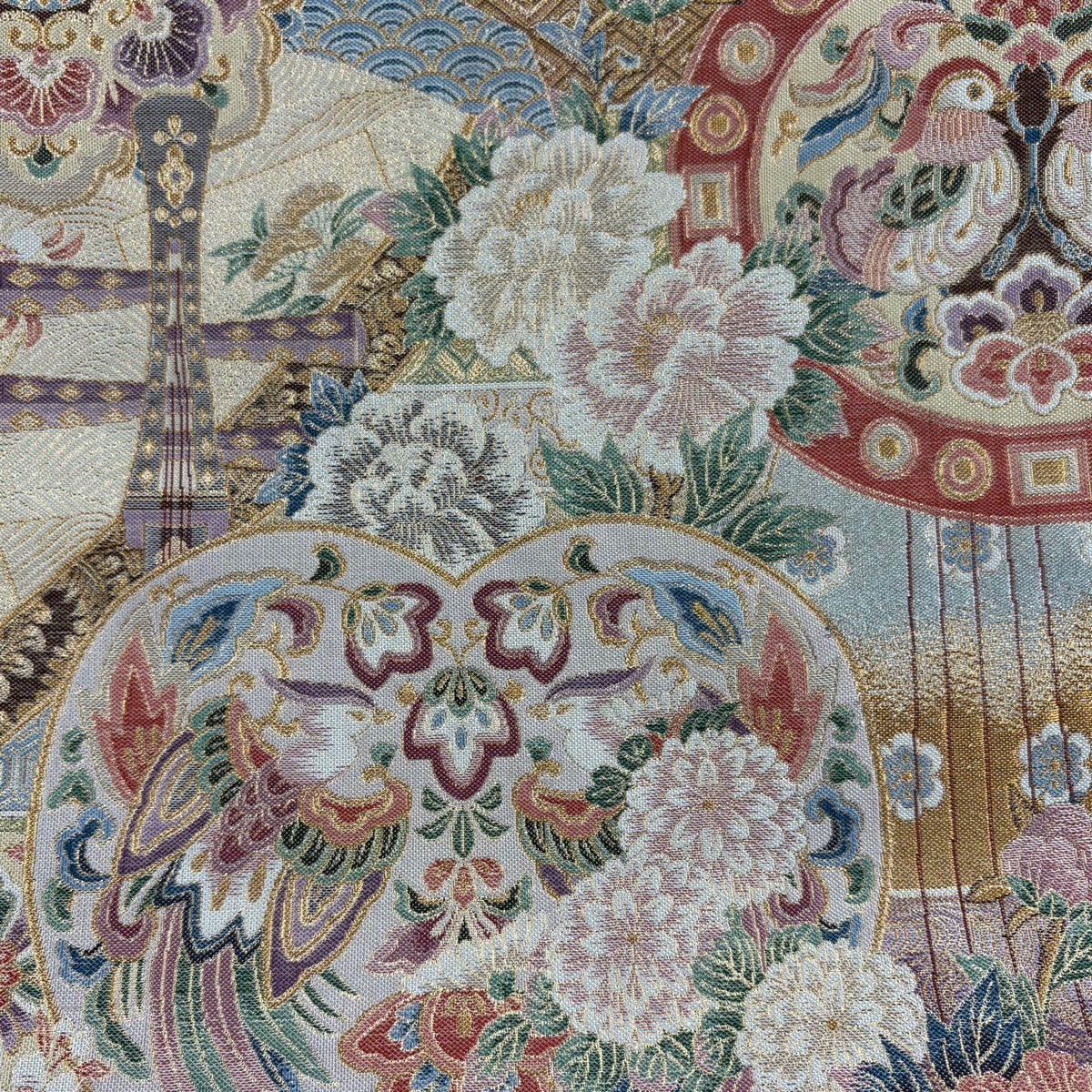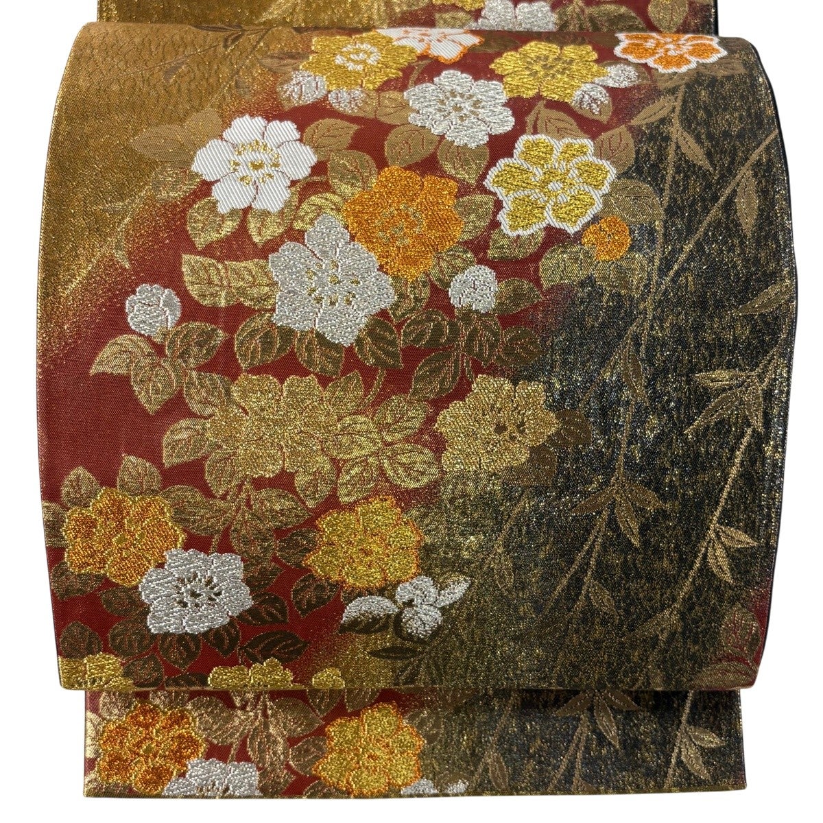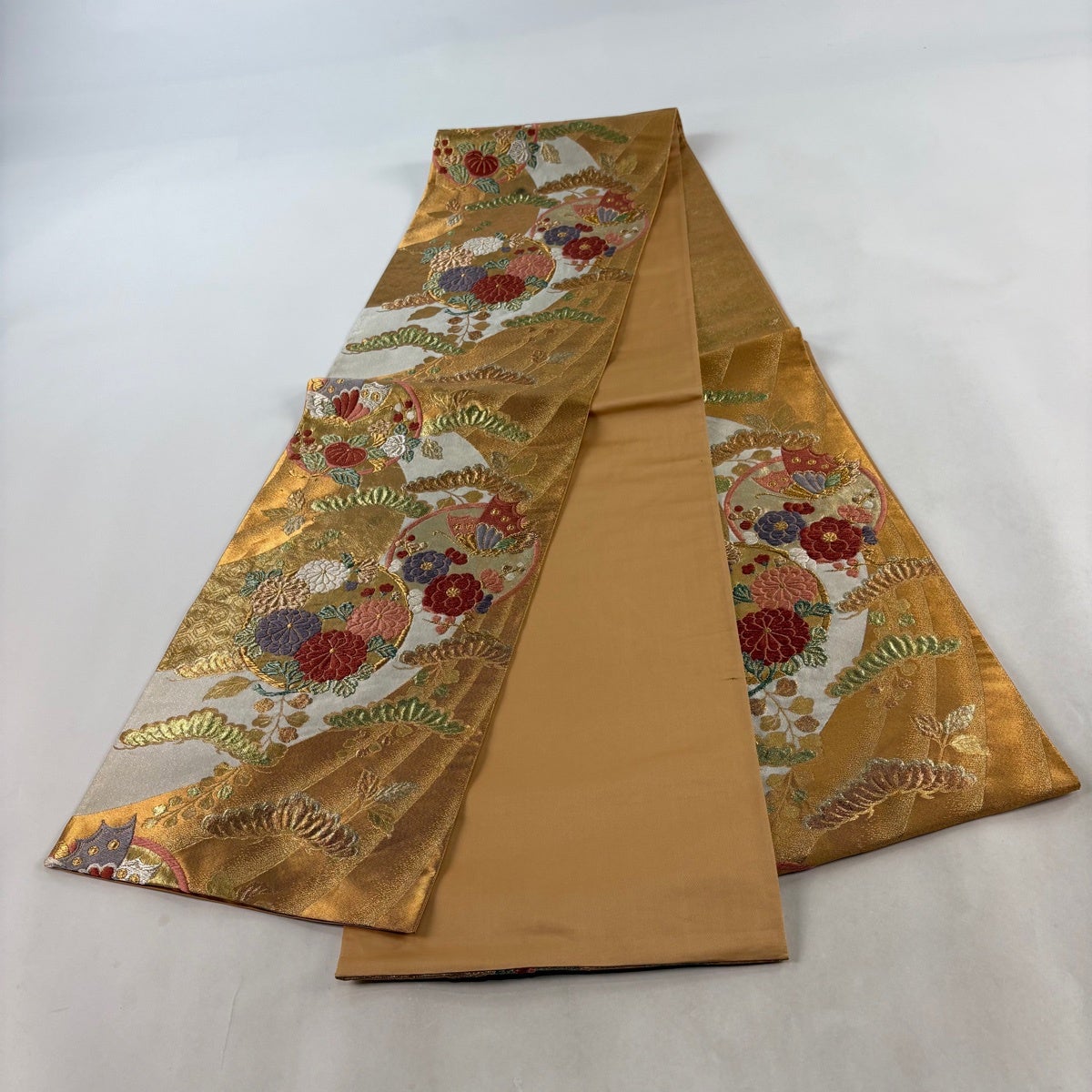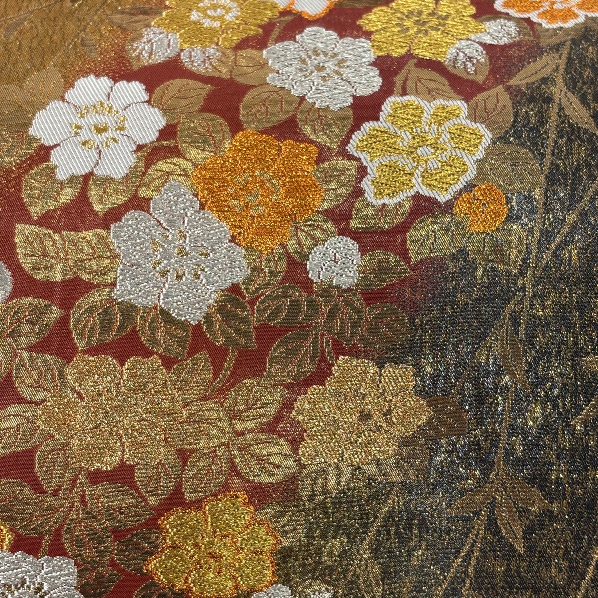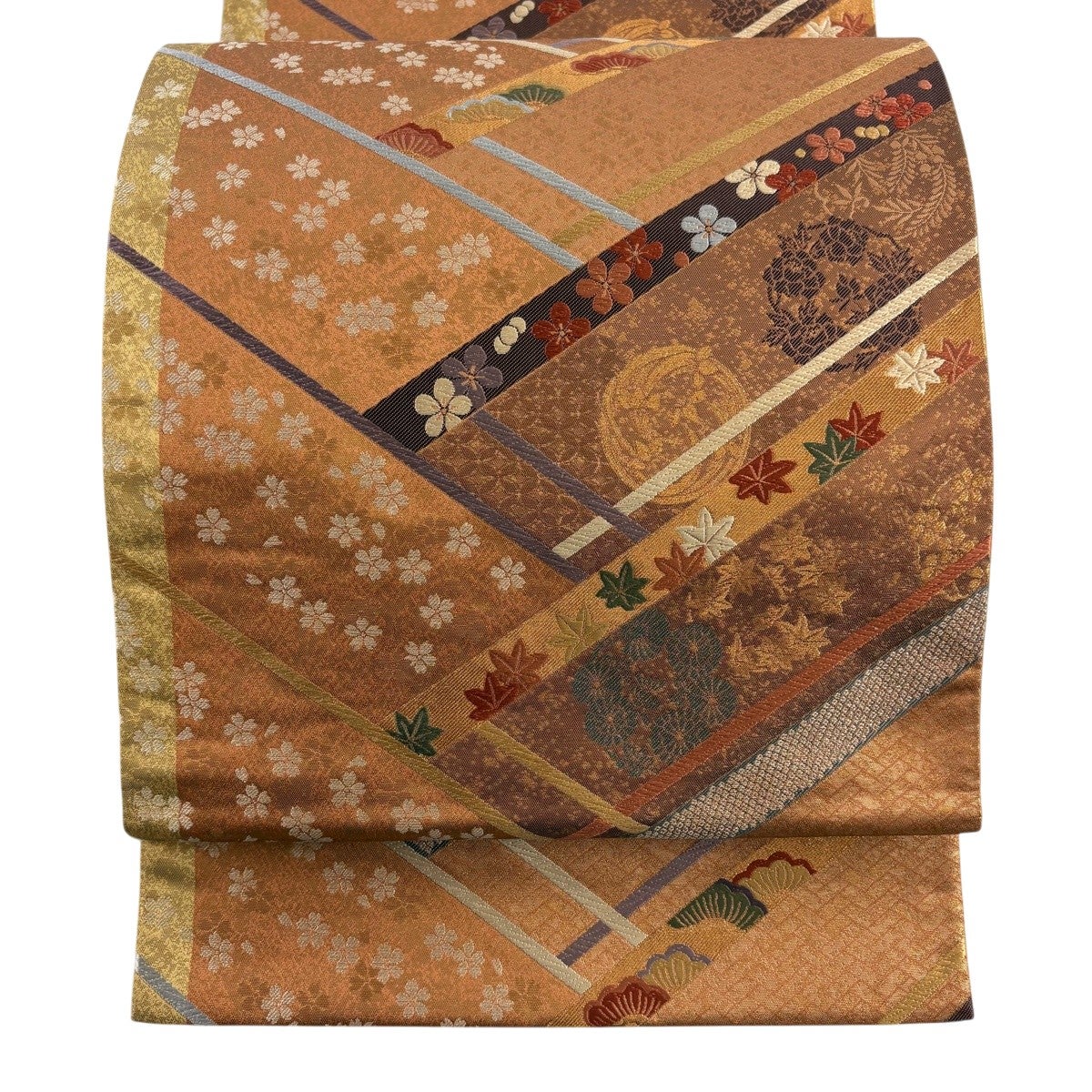 袋帯 秀品 扇面 草花 金銀糸 唐織 オレンジ 六通 正絹