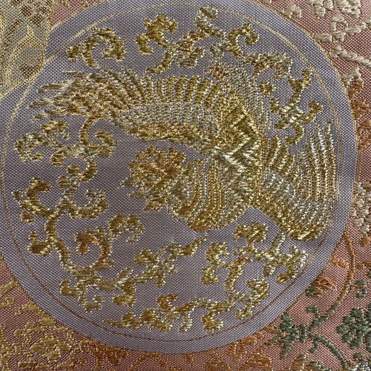 袋帯 秀品 関西仕立て 鳳凰 花丸文 本金箔 唐織 銀色 六通 正絹