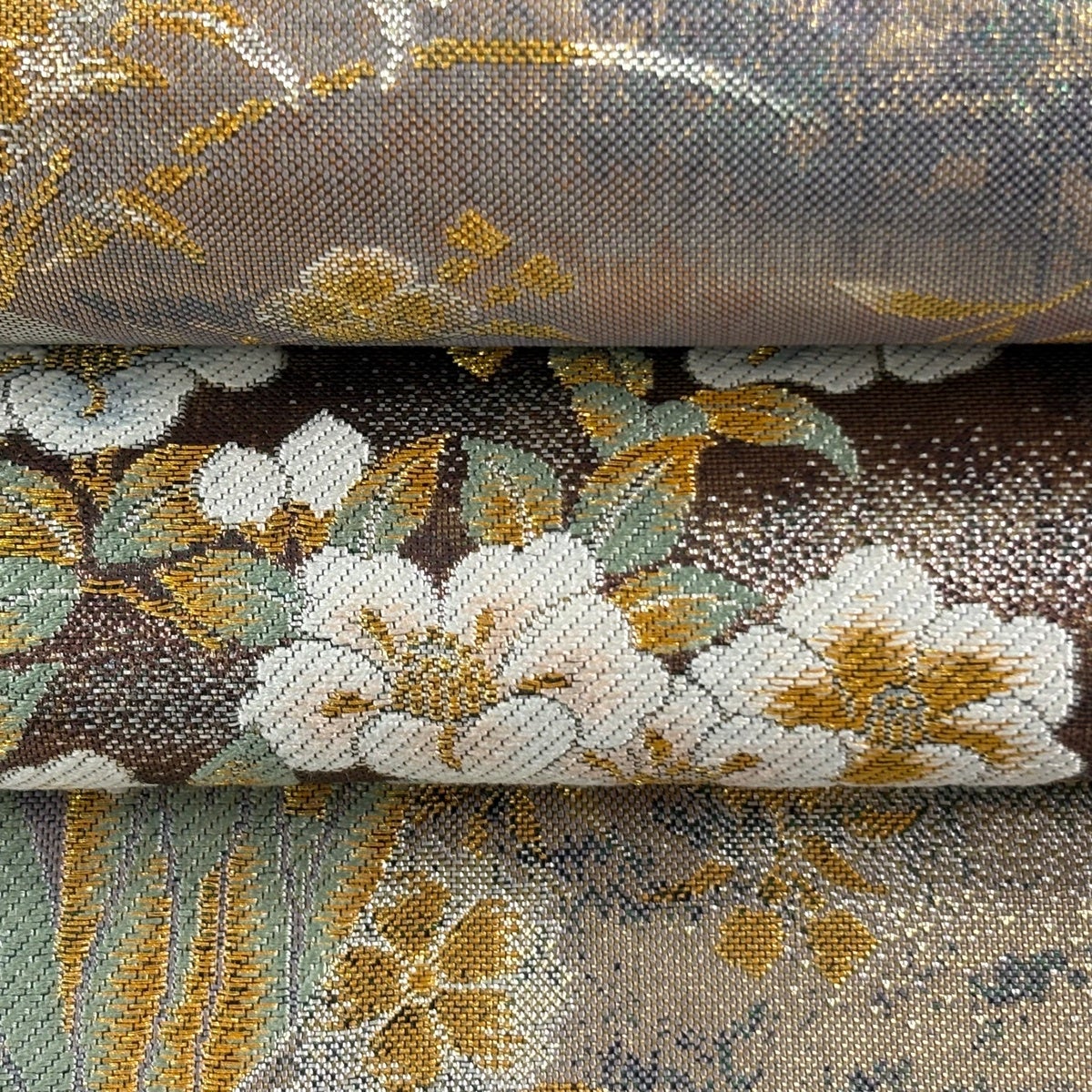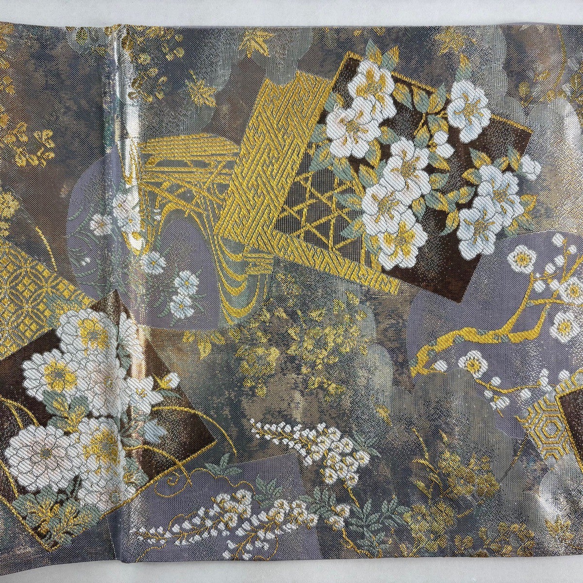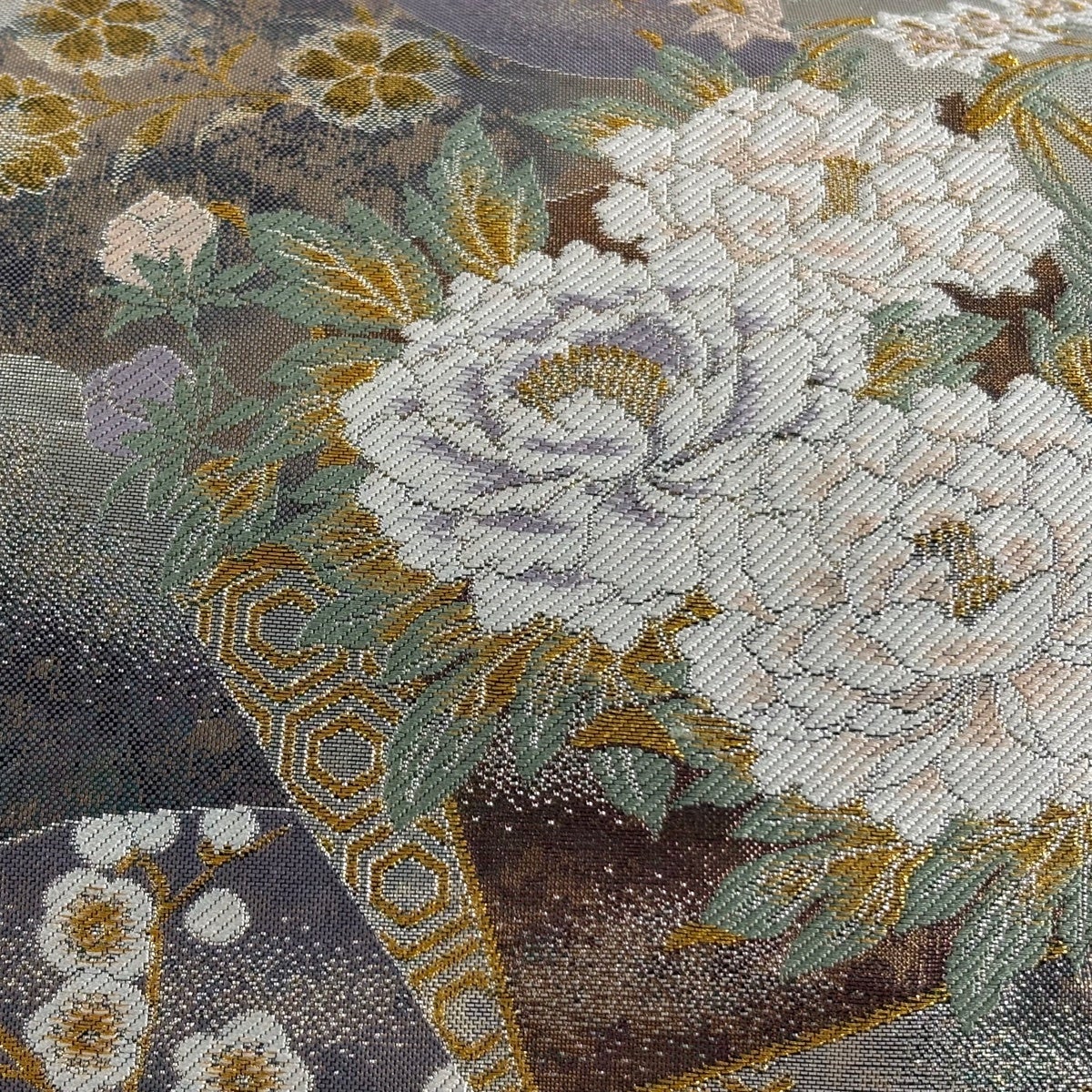 袋帯 秀品 華文 草花 金糸 箔 灰茶 六通 正絹