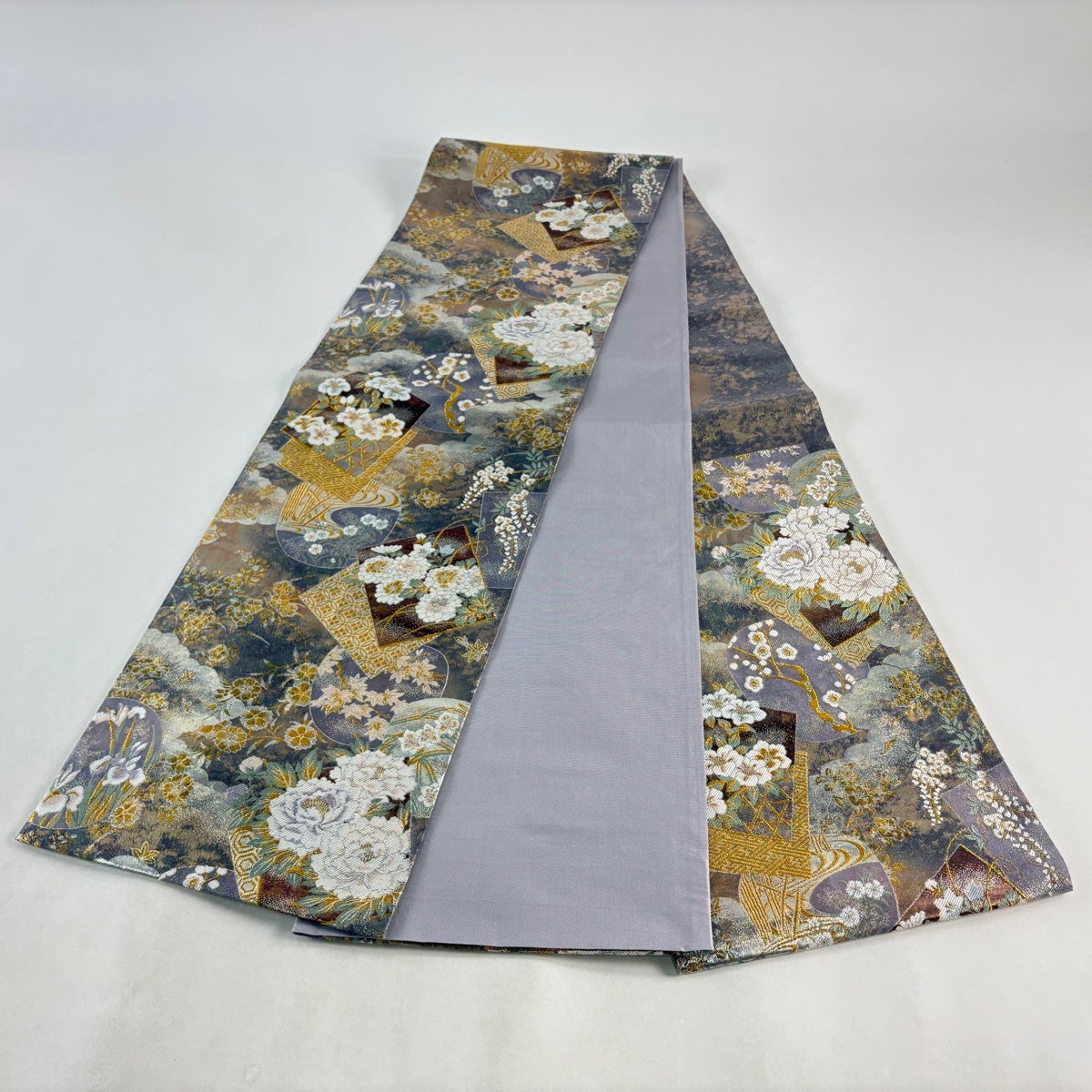 【美品】 袋帯 名品 江戸琳派 色紙 草花 金糸 箔 灰紫 六通 正絹