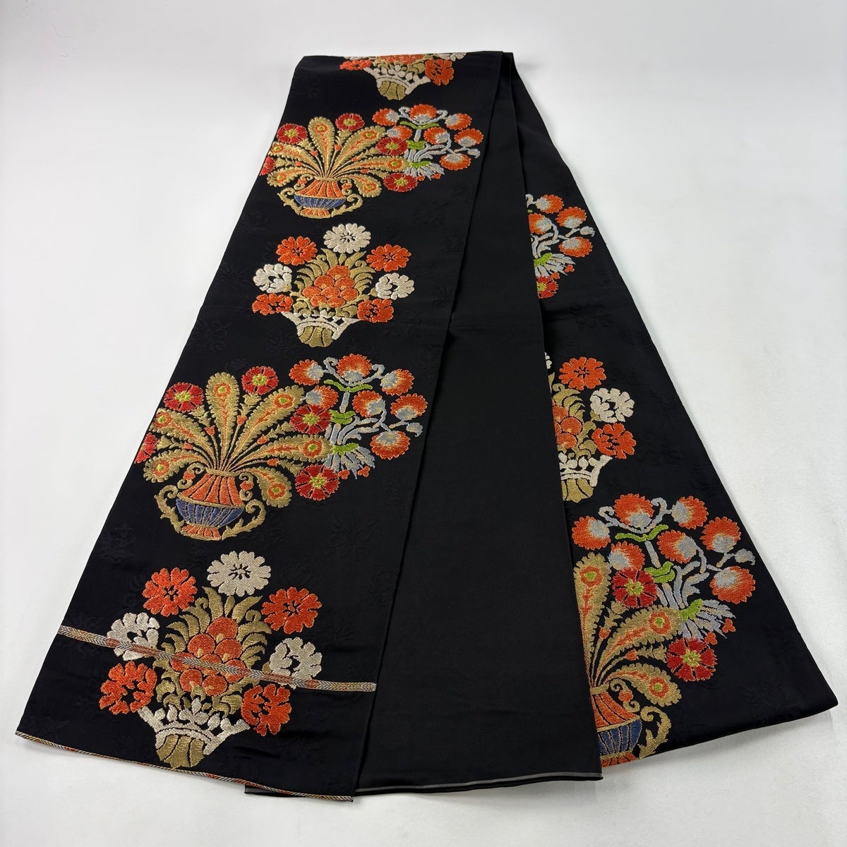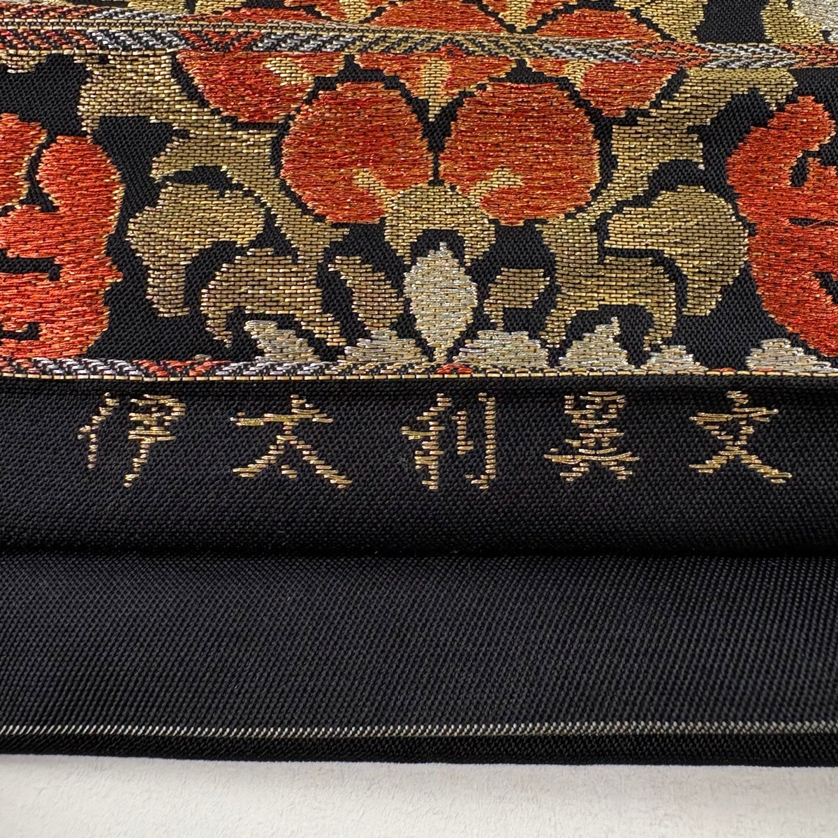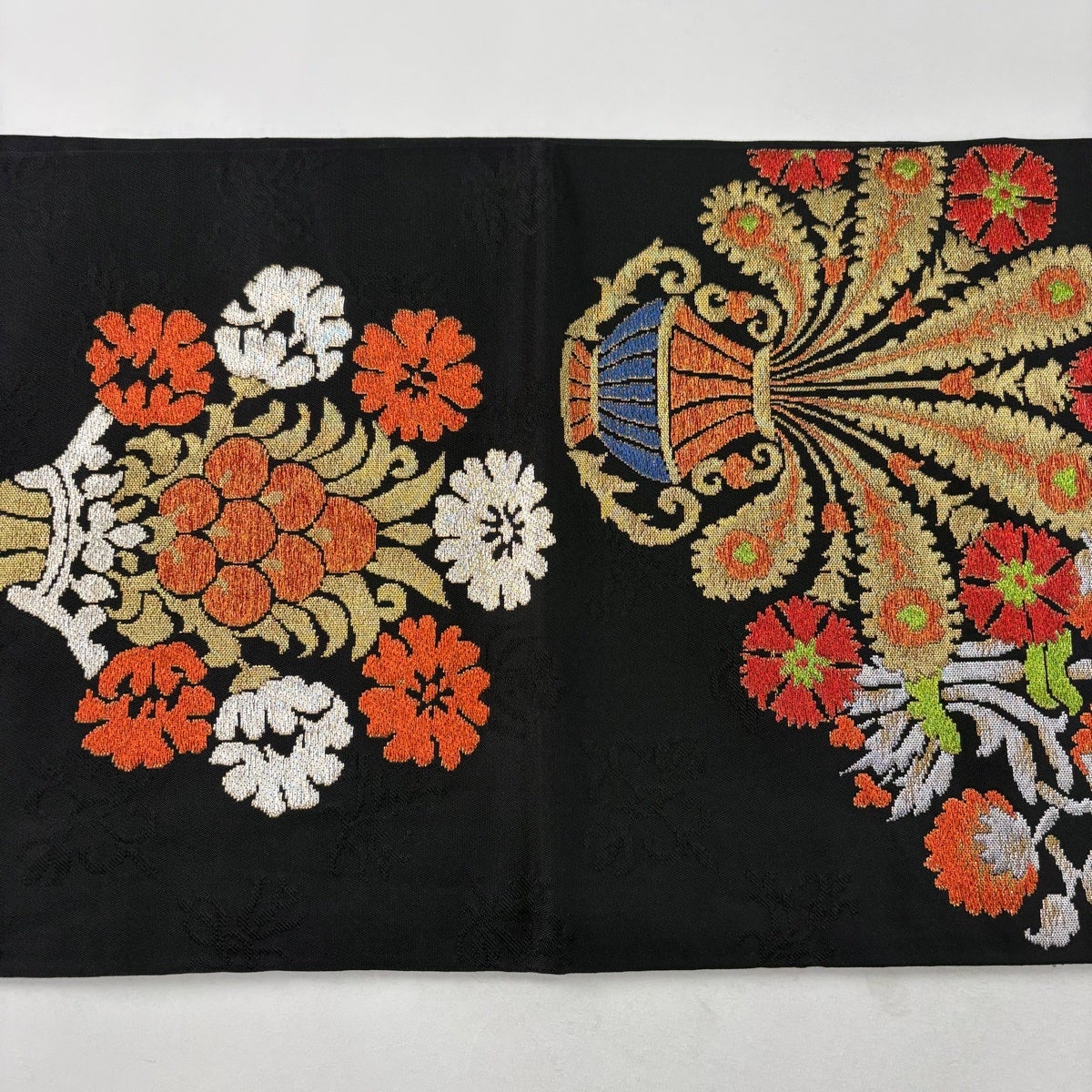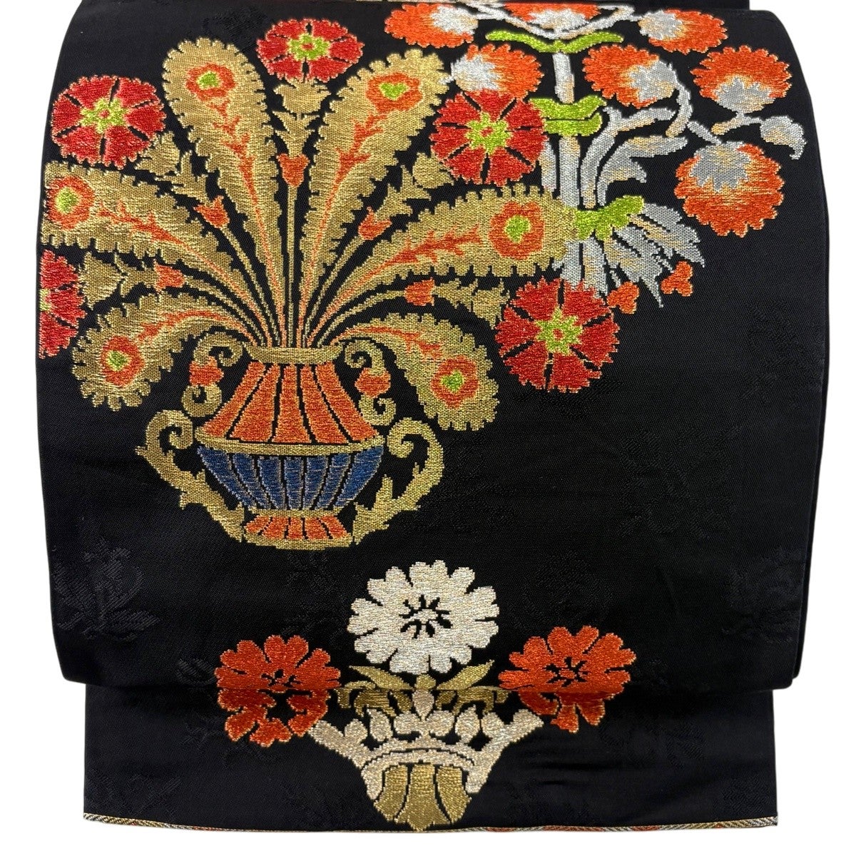 【美品】 袋帯 秀品 関西仕立て 花瓶 地紋 金銀糸 黒 六通 正絹