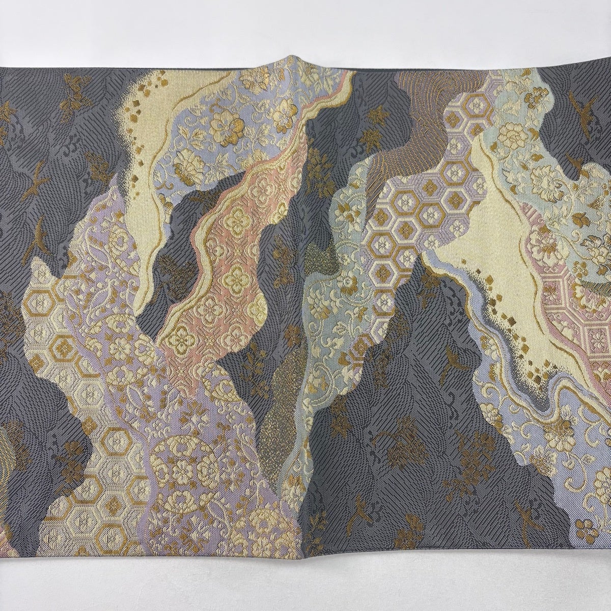 【美品】 袋帯 秀品 花唐草 亀甲 箔 灰色 六通 正絹