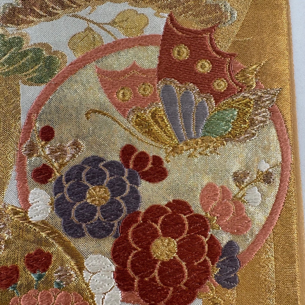 【美品】 袋帯 秀品 花丸文 草花 金糸 箔 オレンジ 六通 正絹