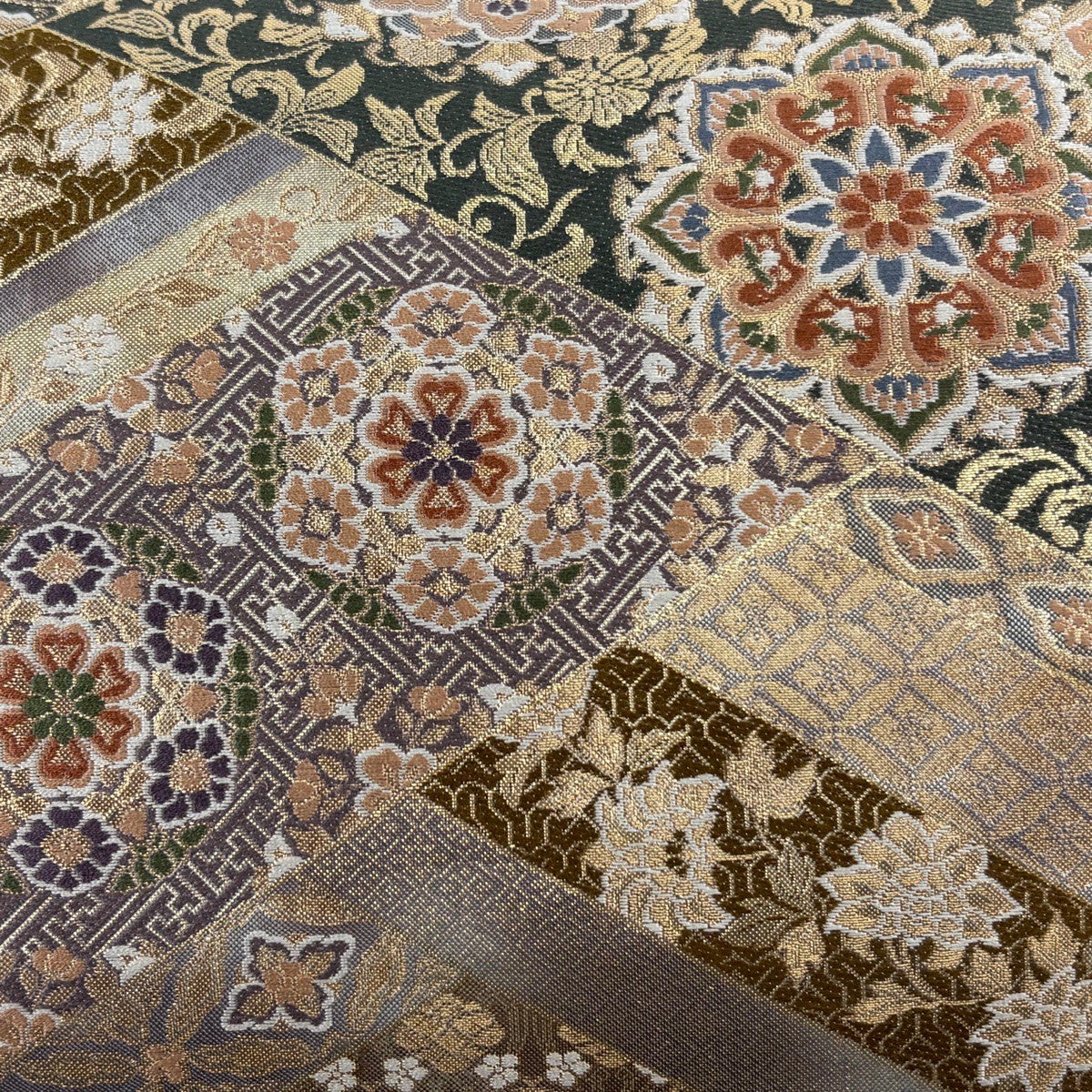 【美品】 袋帯 秀品 蜀江華文 花唐草 切嵌 箔 茶緑色 お太鼓柄 正絹