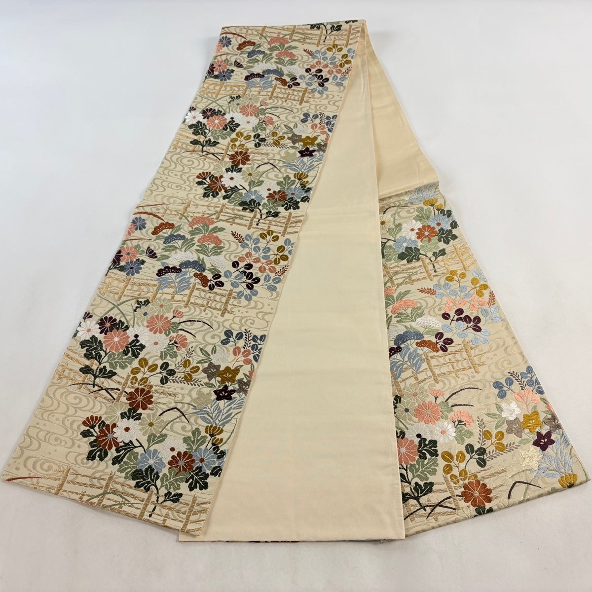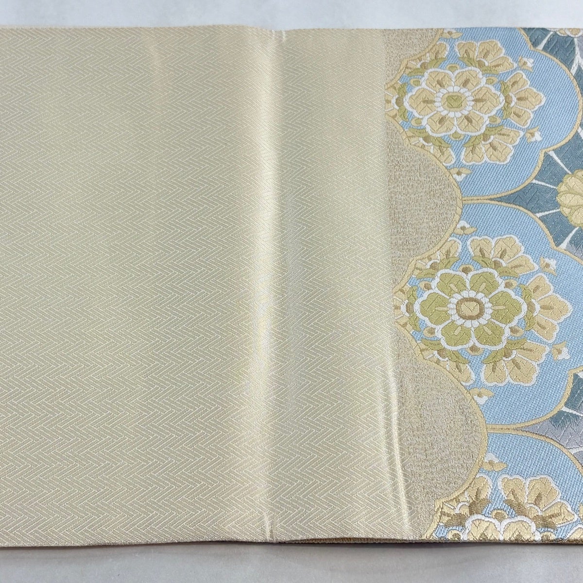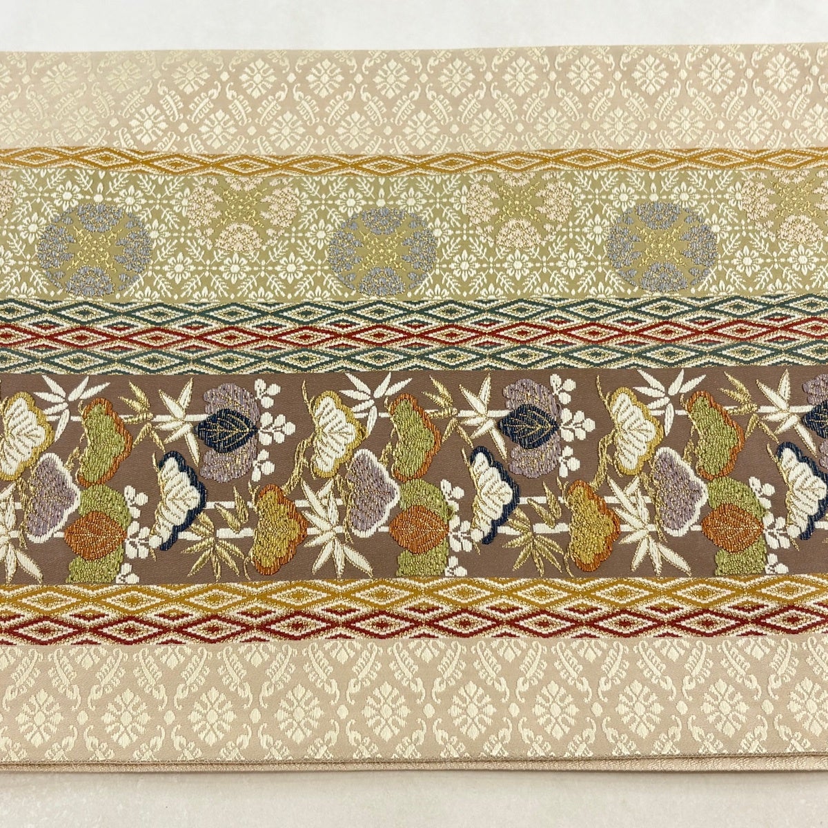 【美品】 袋帯 秀品 華文 花 金銀糸 箔 ベージュ 六通 正絹