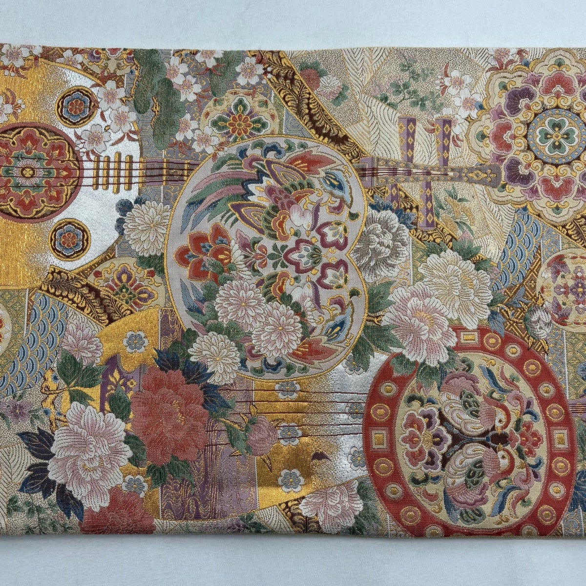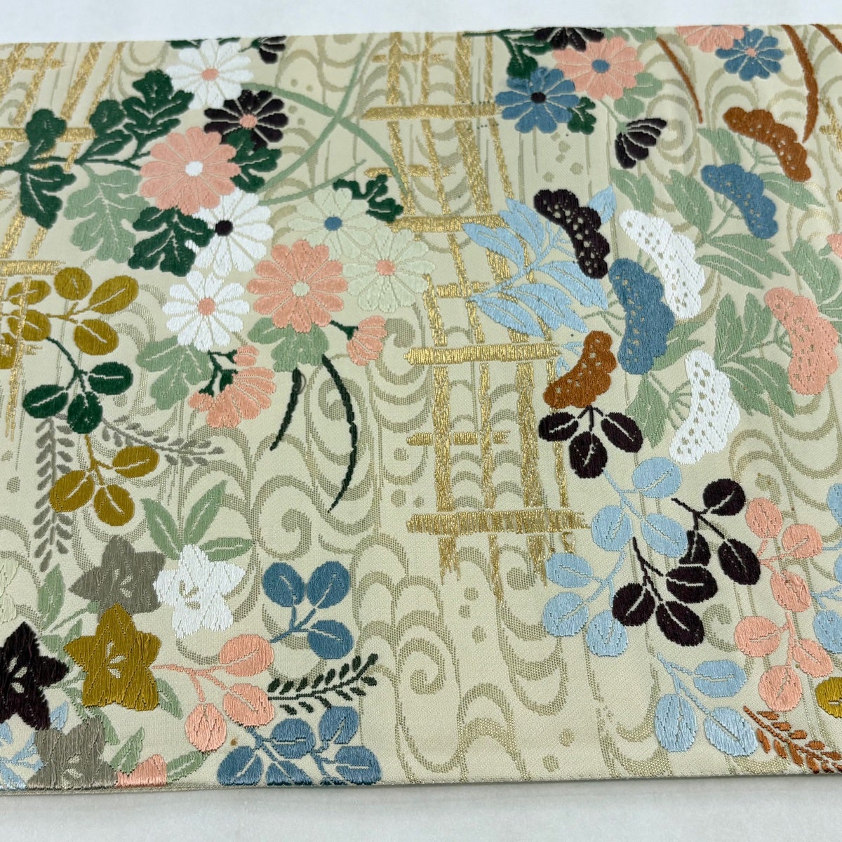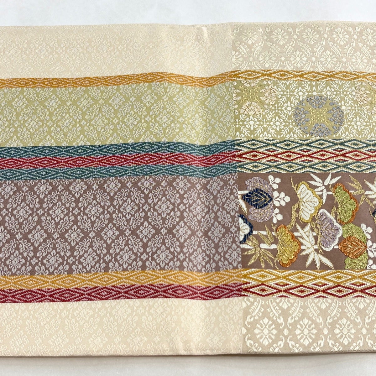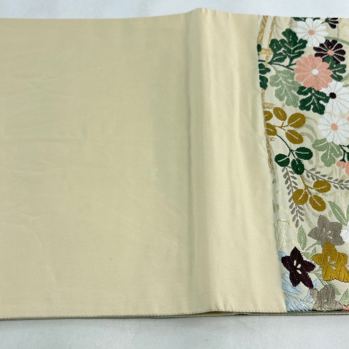 【美品】 袋帯 秀品 華文 花 金銀糸 箔 ベージュ 六通 正絹
