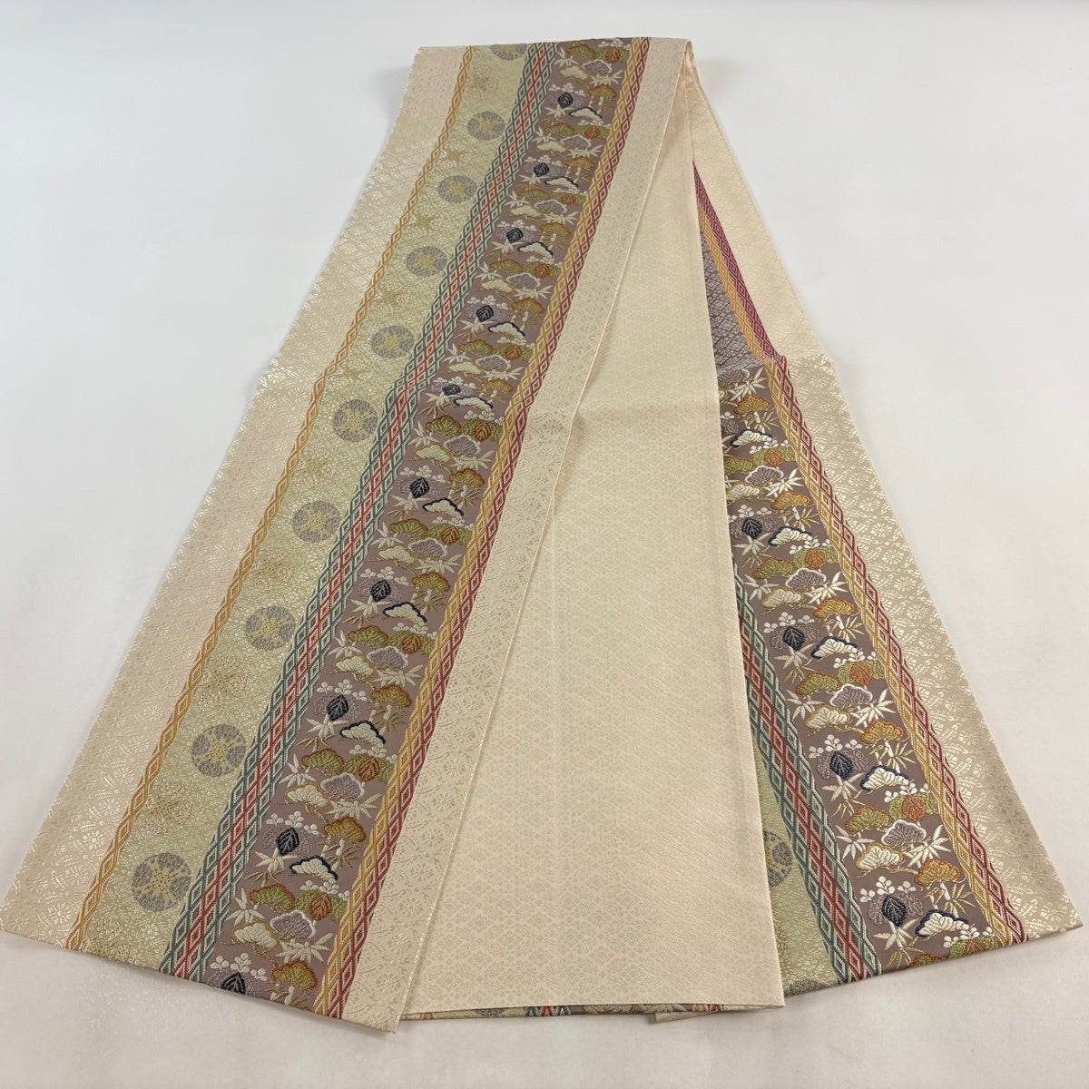 【美品】 袋帯 秀品 貝合わせ 鶴 金糸 箔 ベージュ 六通 正絹