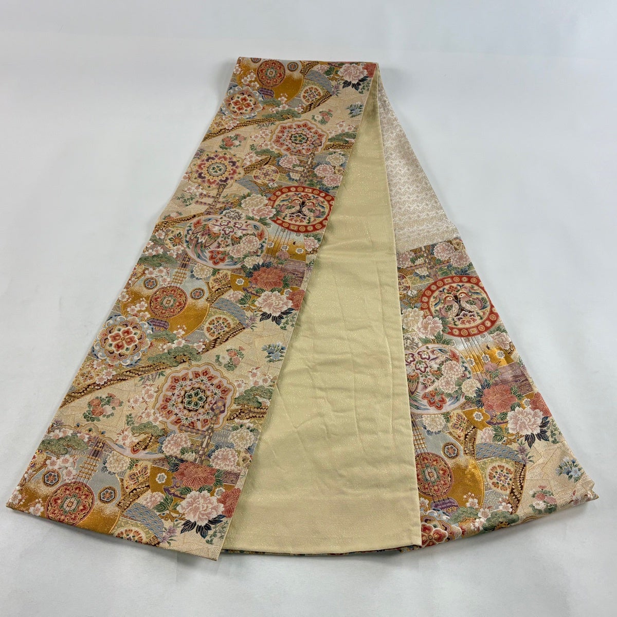 【美品】 袋帯 秀品 振袖向き 花 有職文様 箔 金糸 ベージュ 六通 正絹