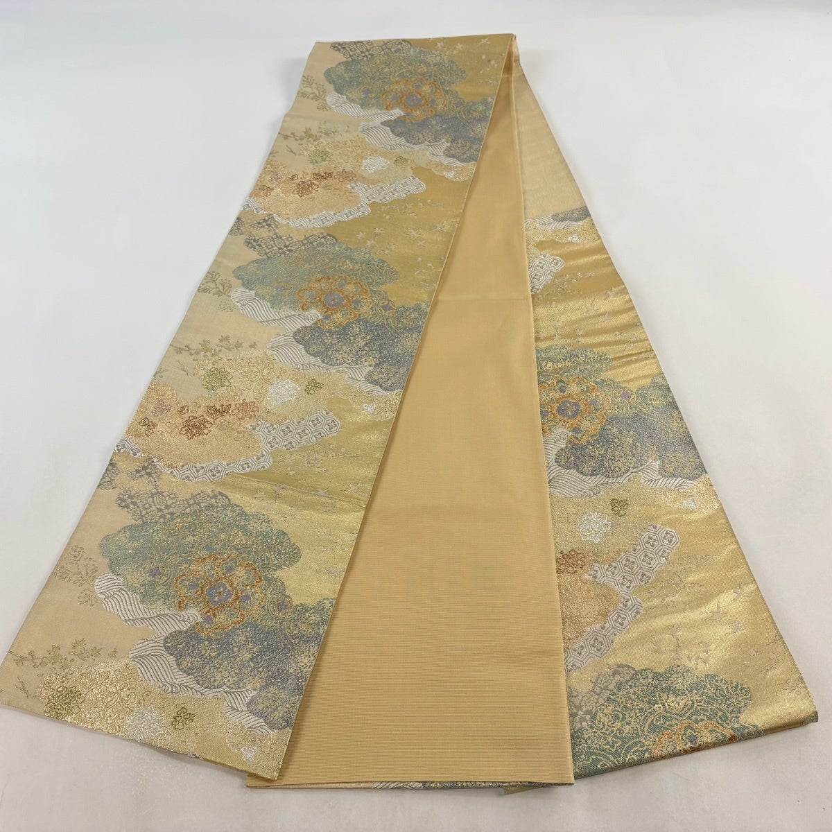 【美品】 袋帯 秀品 草花 波 金糸 箔 金色 全通 正絹