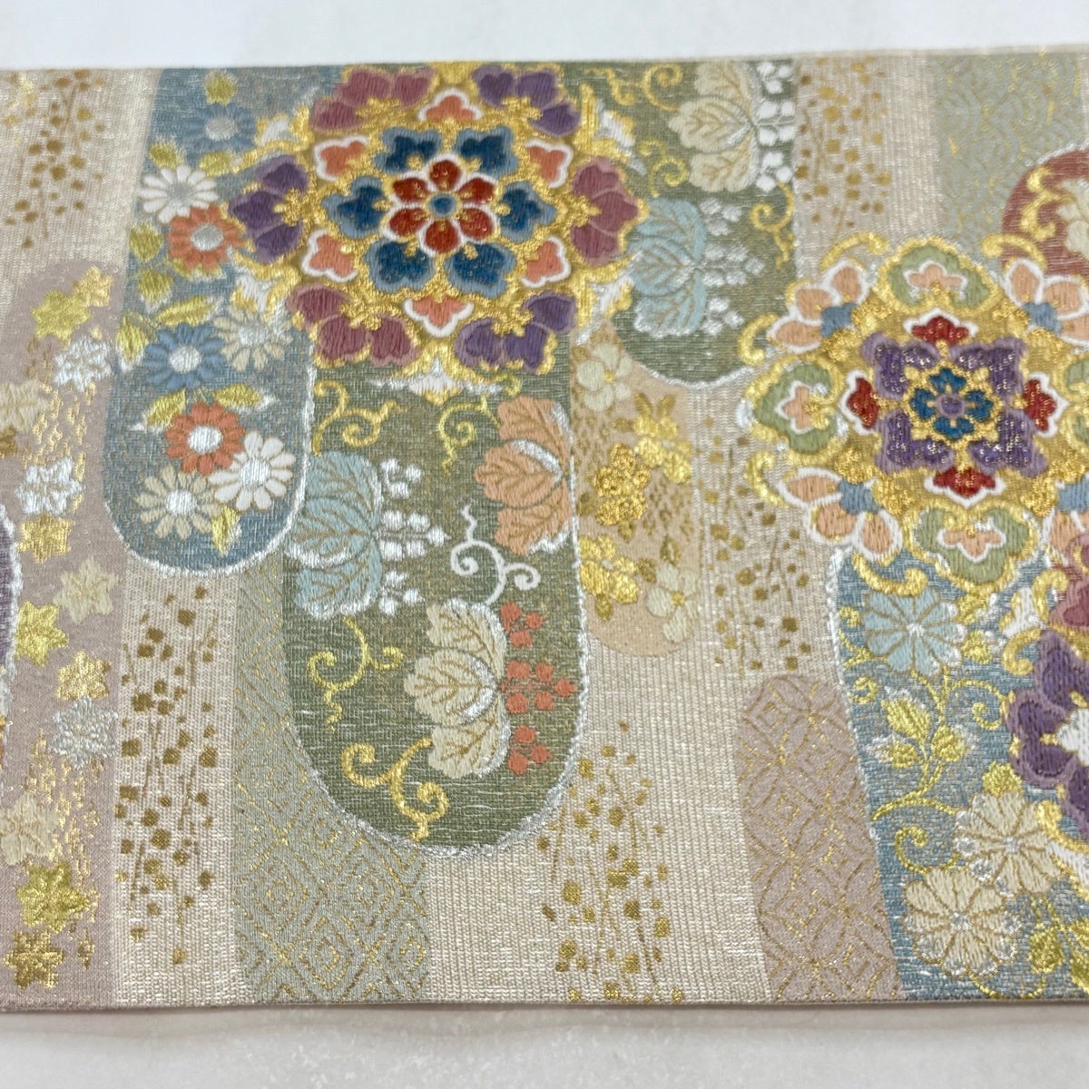【美品】 袋帯 秀品 華文 花唐草 金糸 箔 ベージュ 六通 正絹