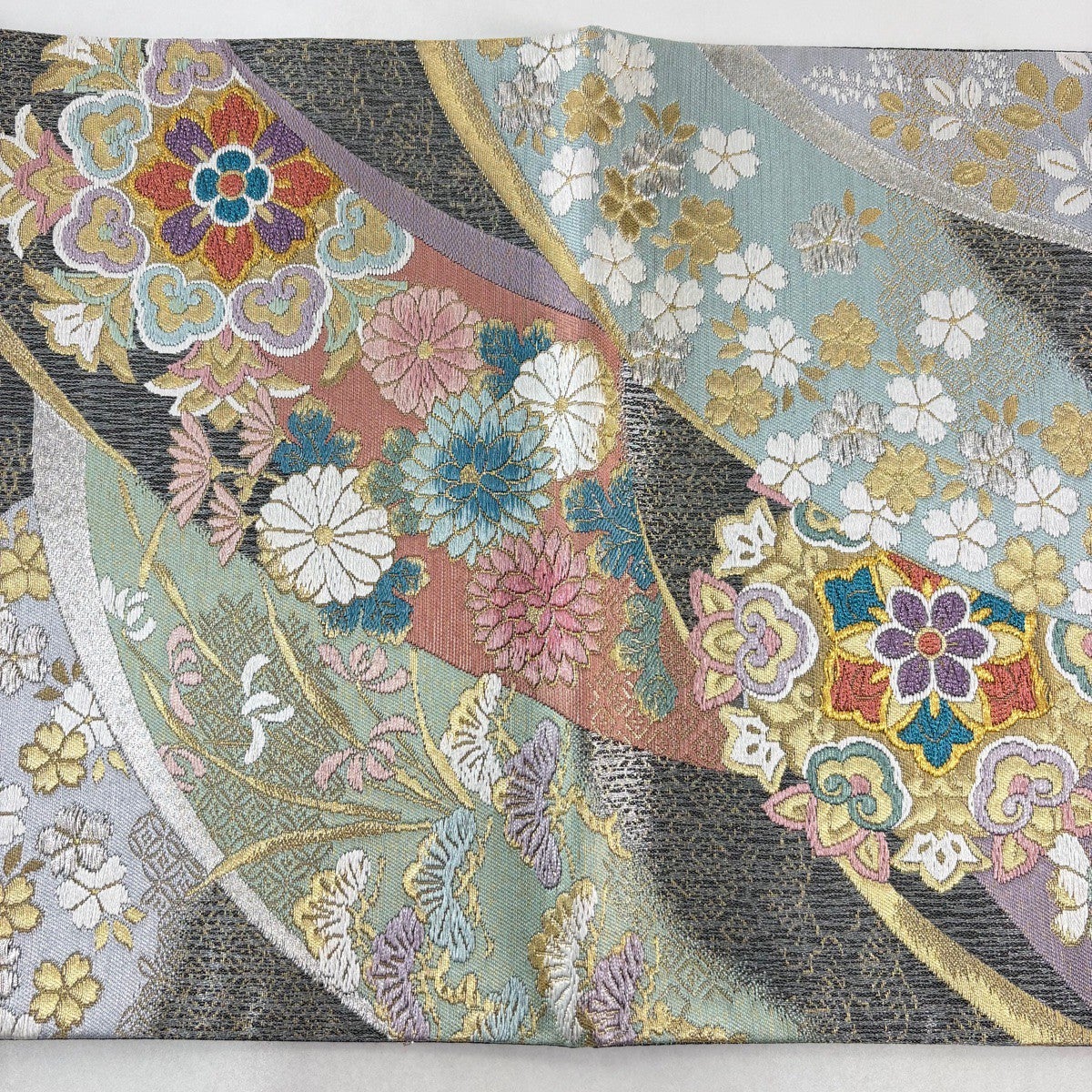 【美品】 袋帯 秀品 桜 草花 金銀糸 箔 青緑 六通 正絹