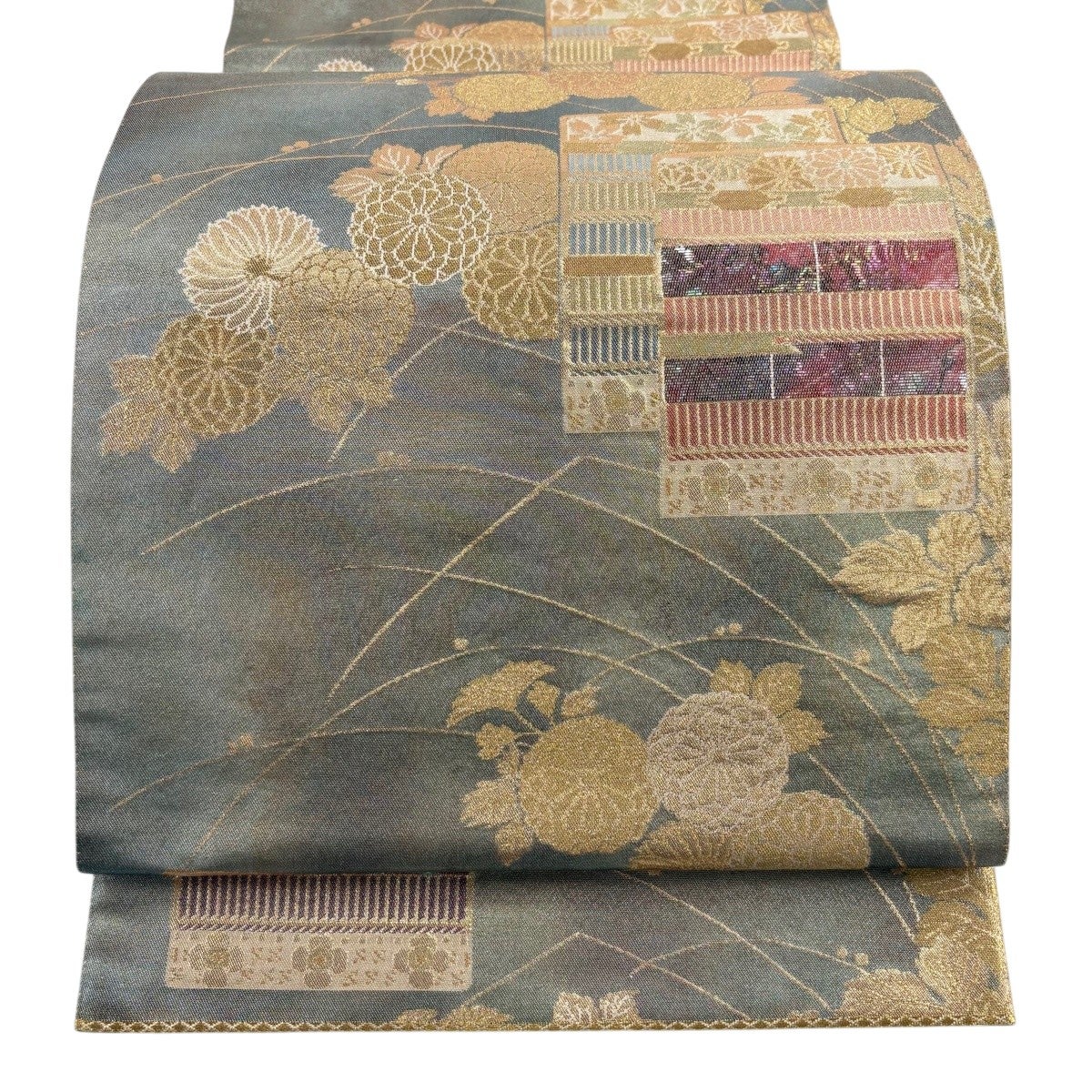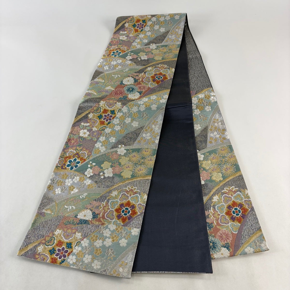 【美品】 袋帯 秀品 華文 草花 金銀糸 箔 灰緑 六通 正絹
