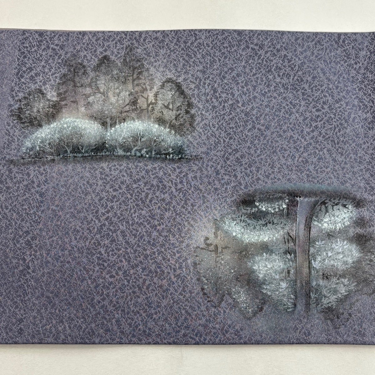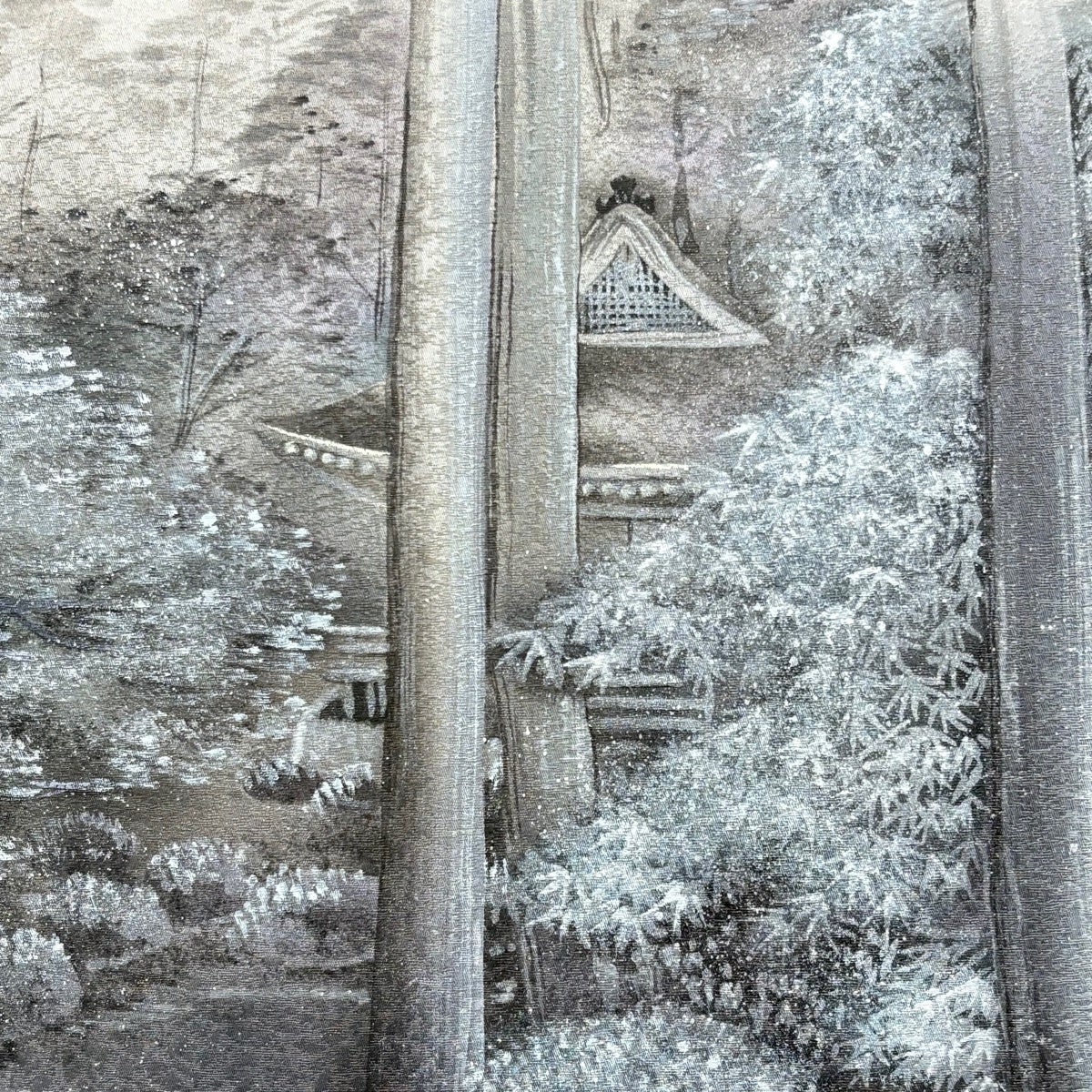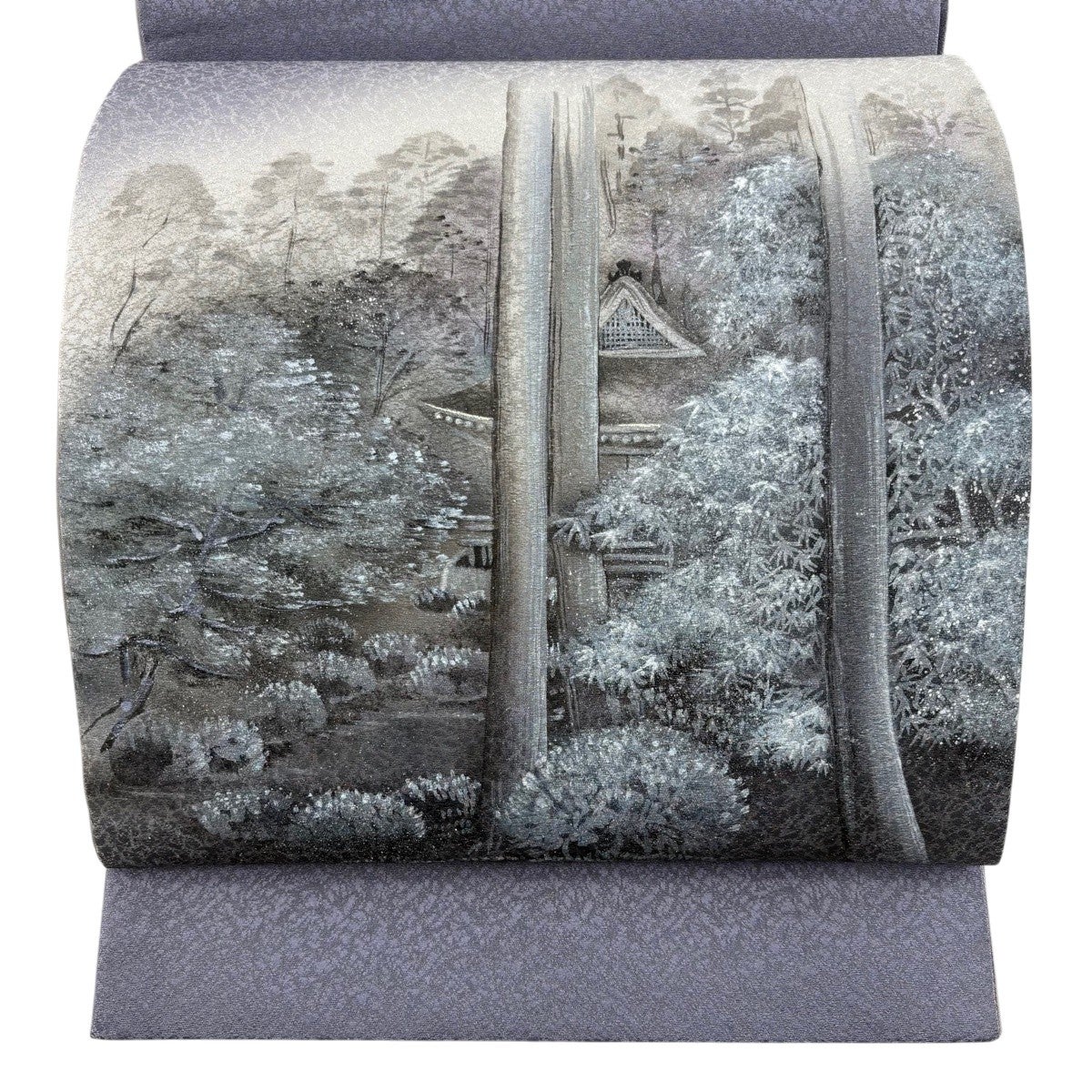 【美品】 袋帯 秀品 建物 風景 銀通し 灰紫 お太鼓柄 正絹