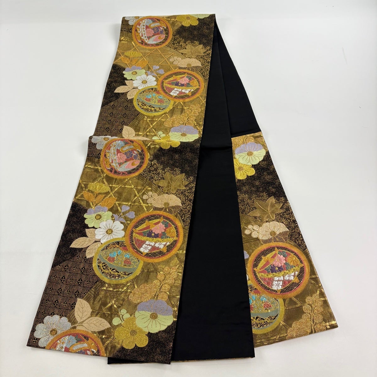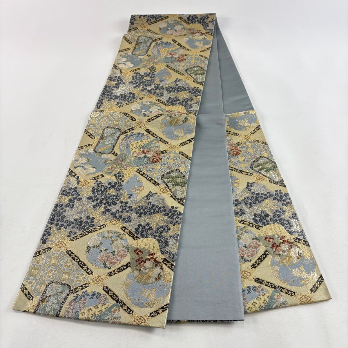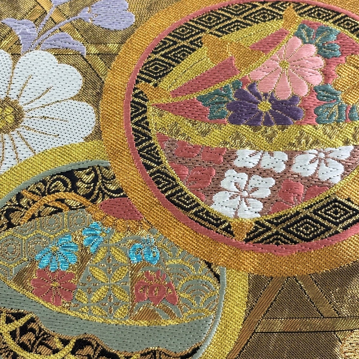 【美品】 袋帯 秀品 扇面 草花 金糸 箔 金色 お太鼓柄 正絹