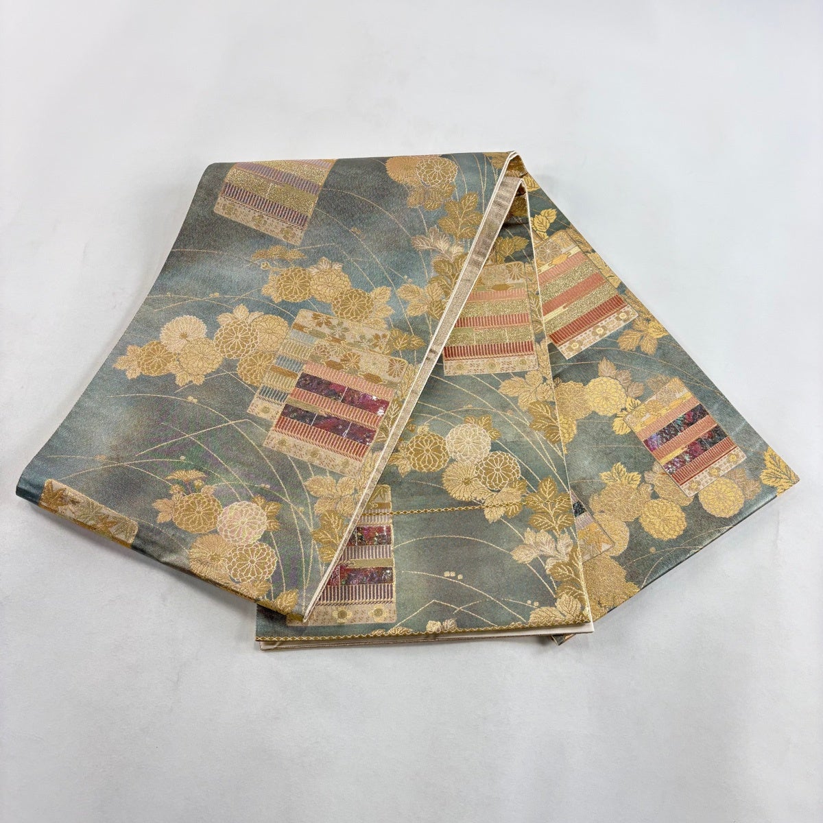 【美品】 袋帯 名品 扇 草花 箔 灰緑 お太鼓柄 正絹
