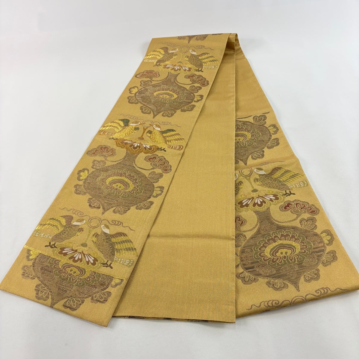 袋帯 秀品 花唐草 鳥 刺繍 金彩 金茶 お太鼓柄 正絹