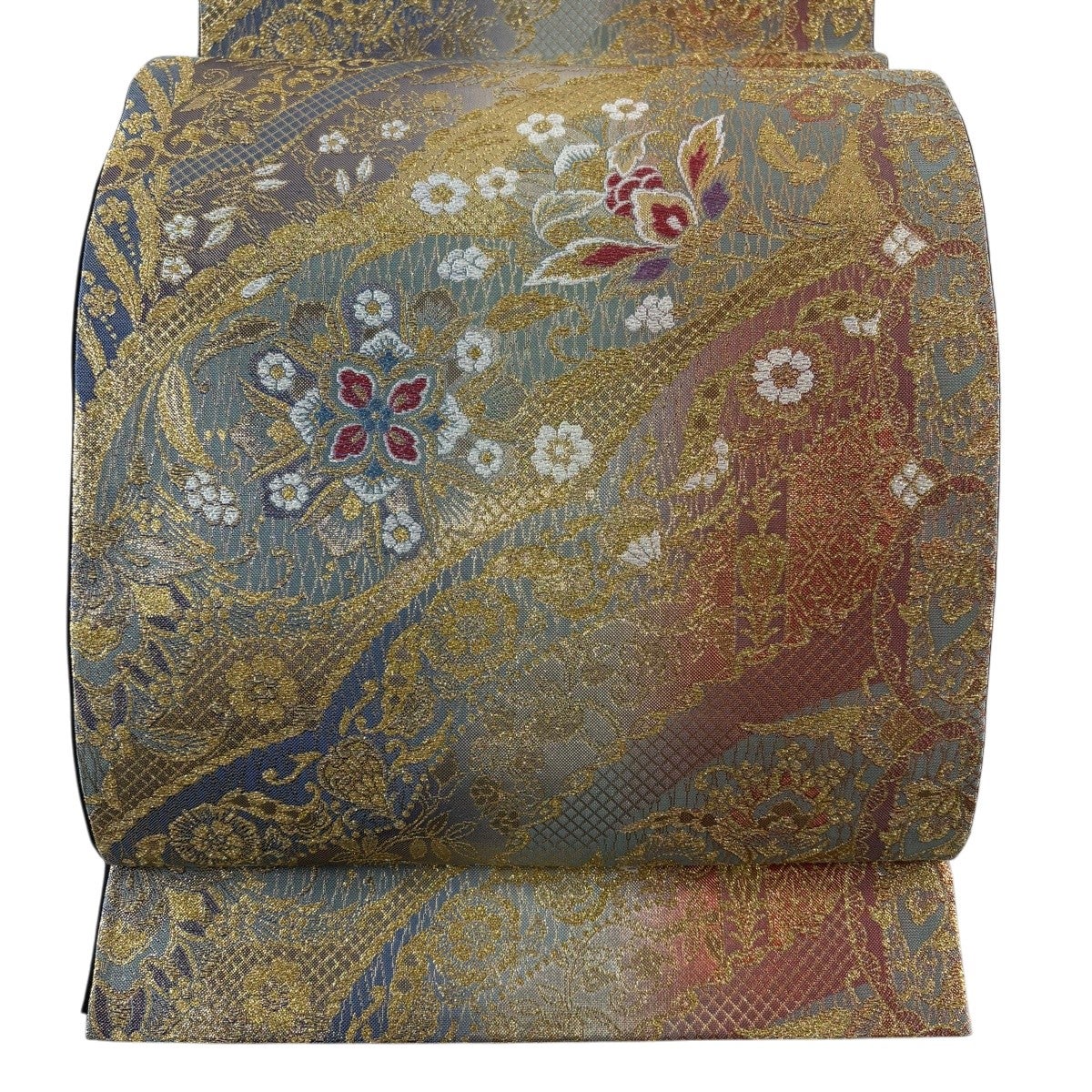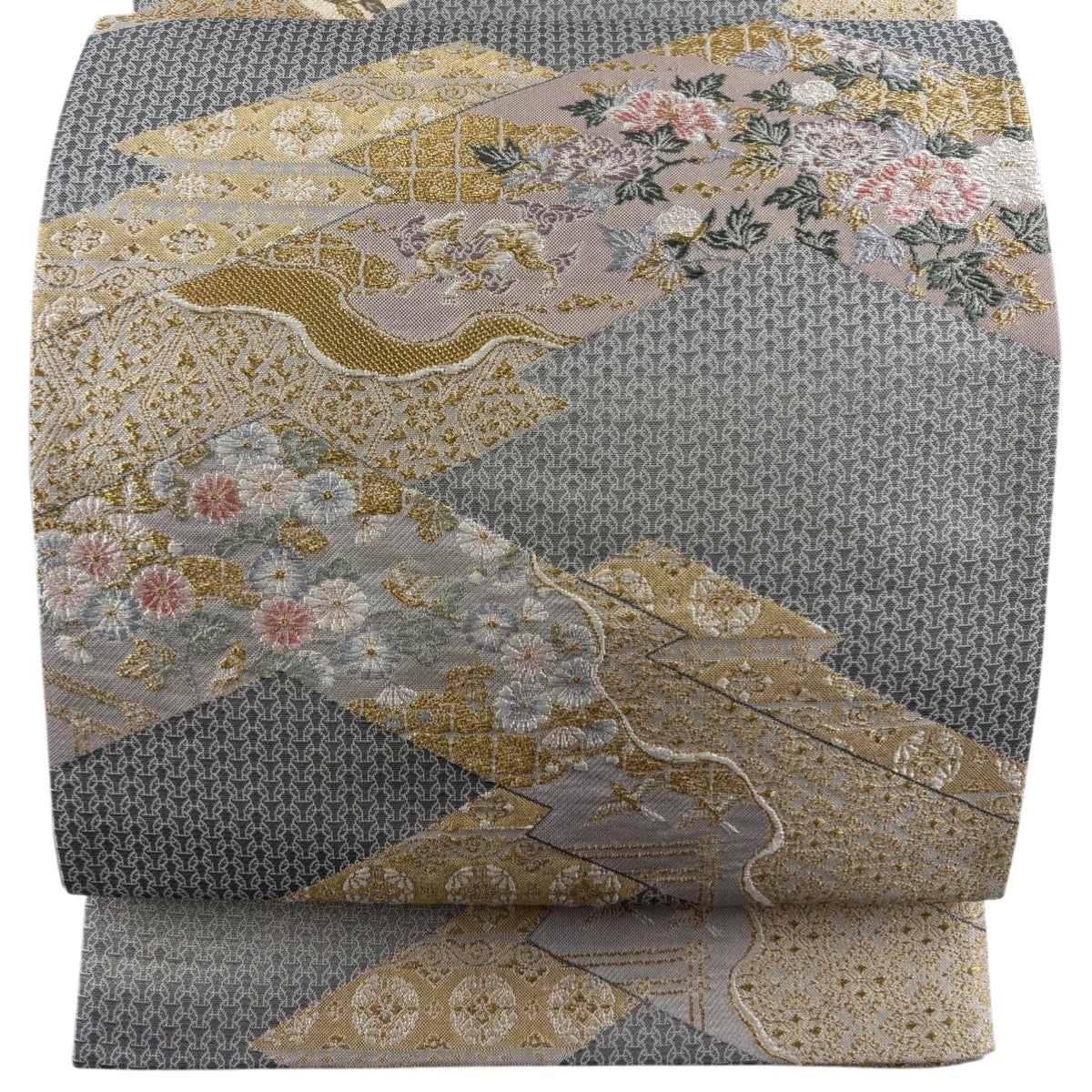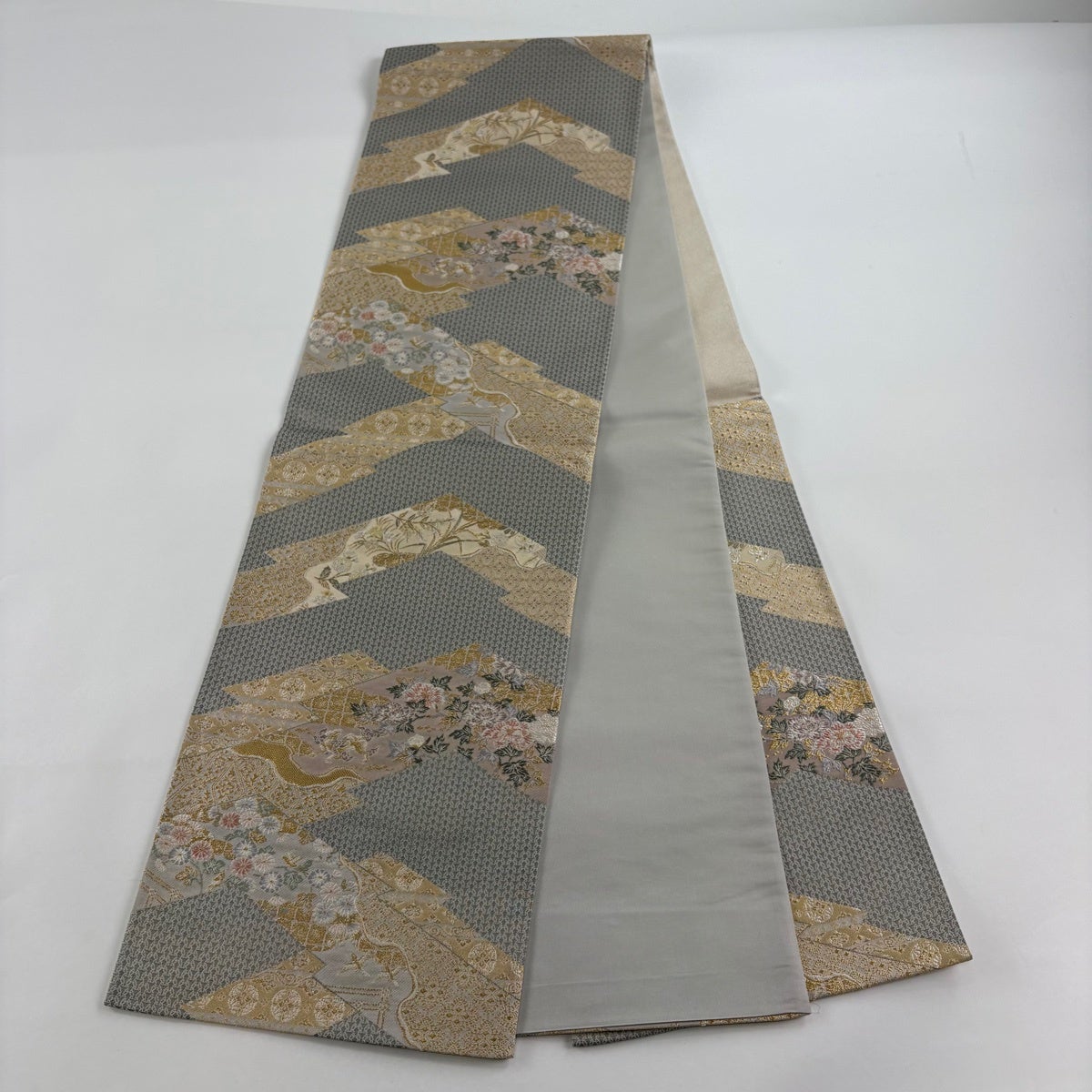 【美品】 袋帯 秀品 華文 花唐草 唐織 箔 灰色 六通 正絹
