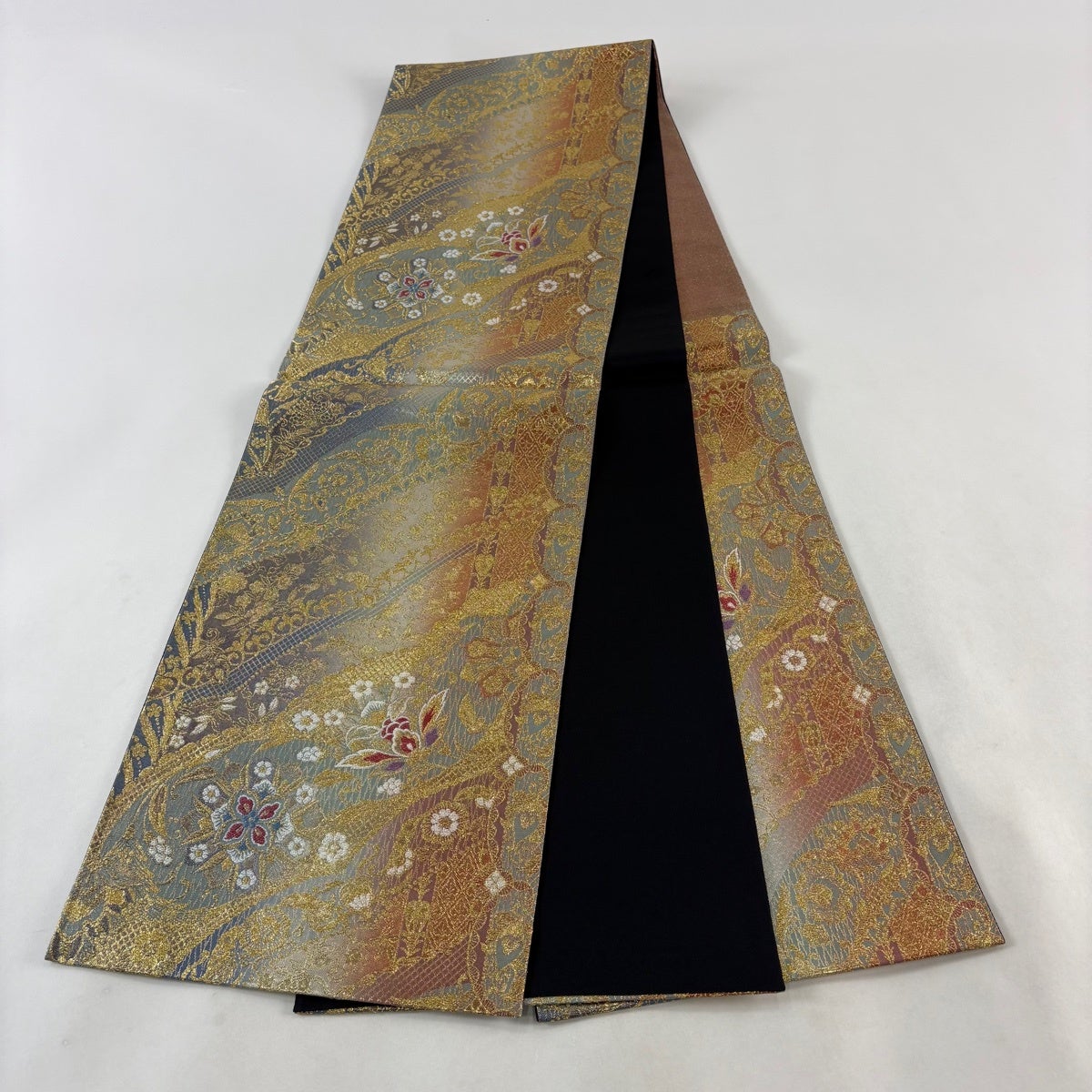 【美品】 袋帯 秀品 振袖向き 関西仕立て 華文 草花 金銀糸 箔 黒 全通 正絹