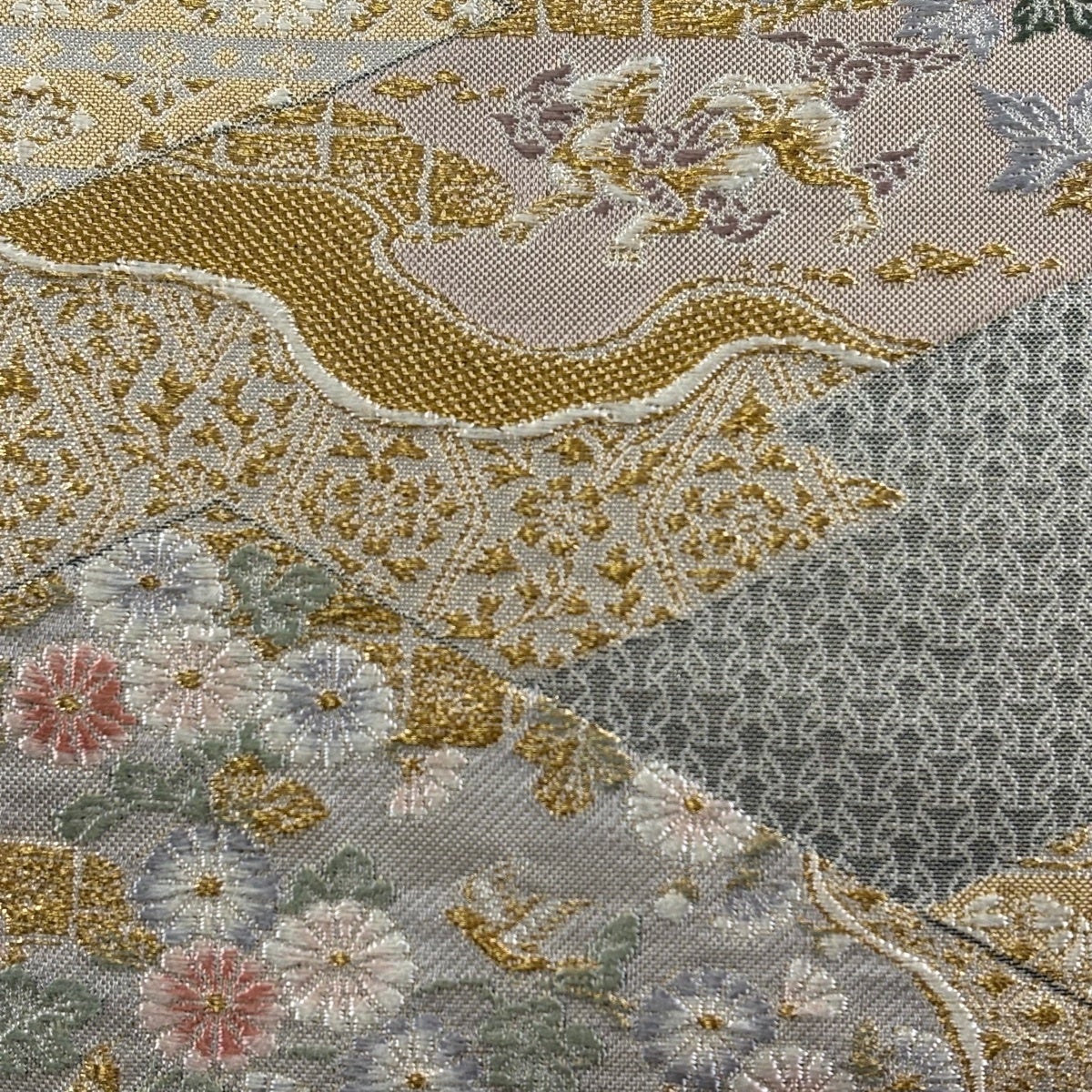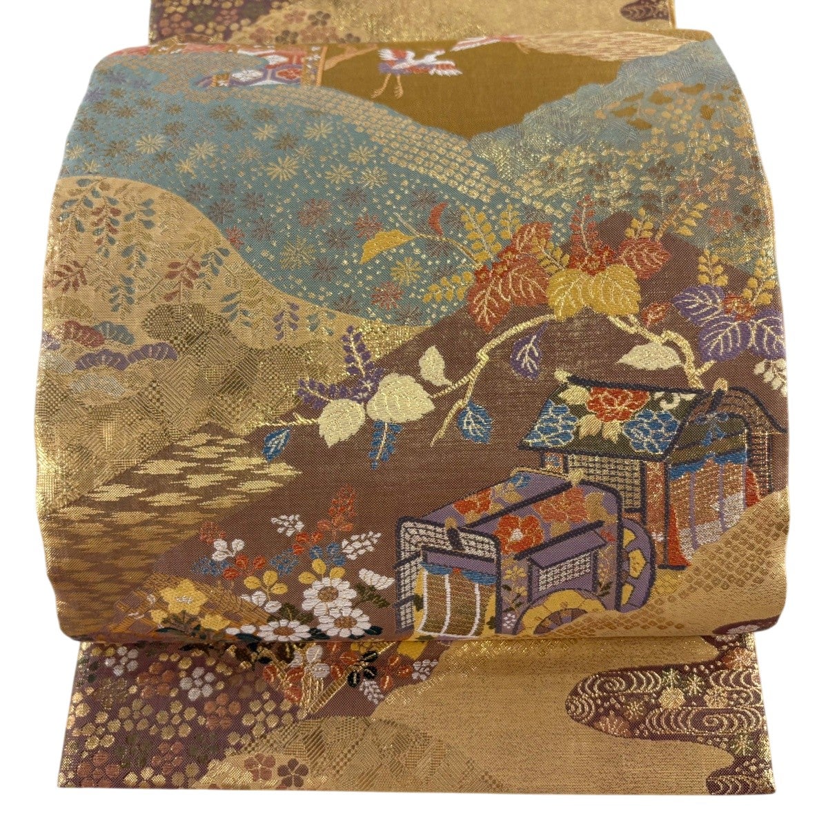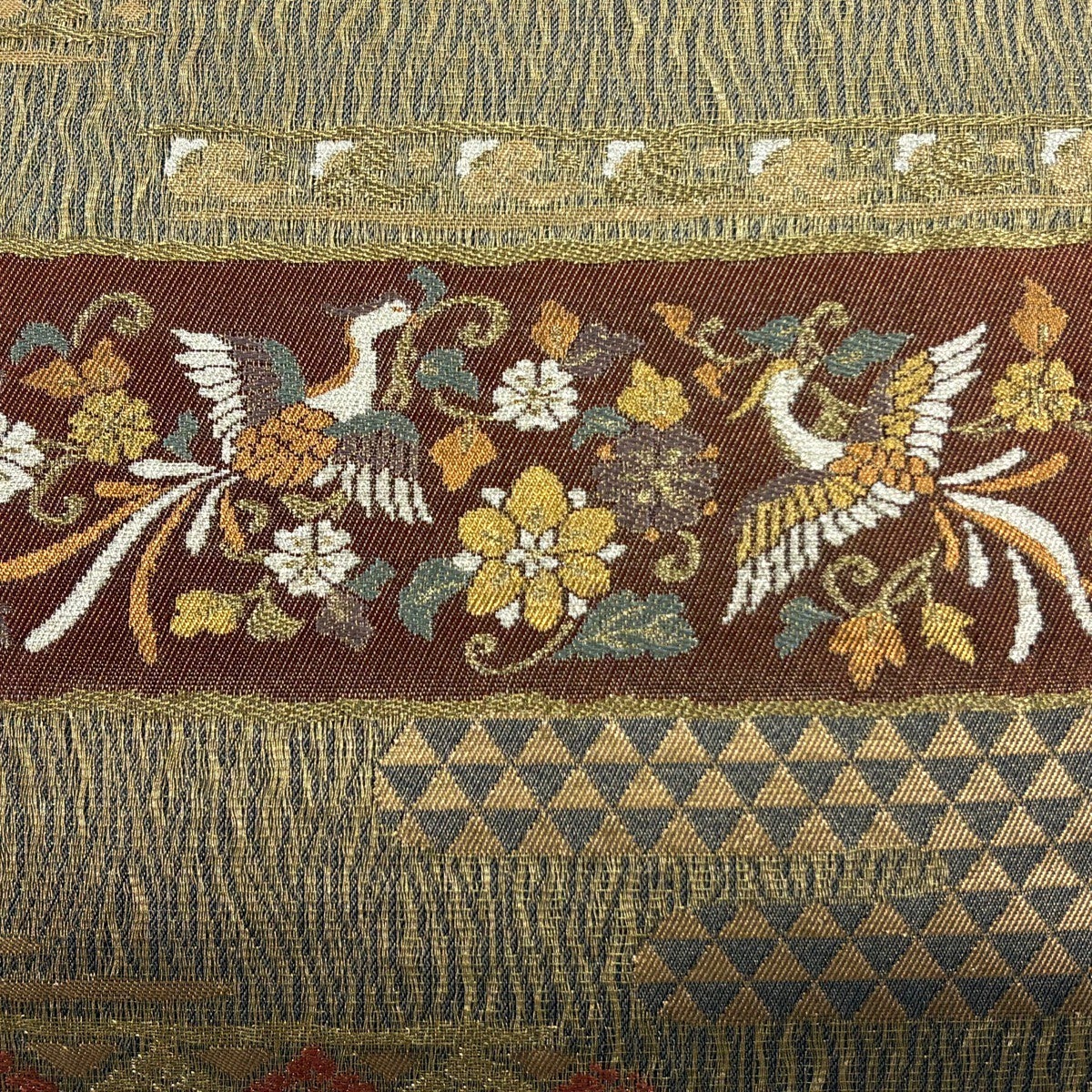 袋帯 秀品 花鳥 観世水 唐織 箔 灰茶 六通 正絹