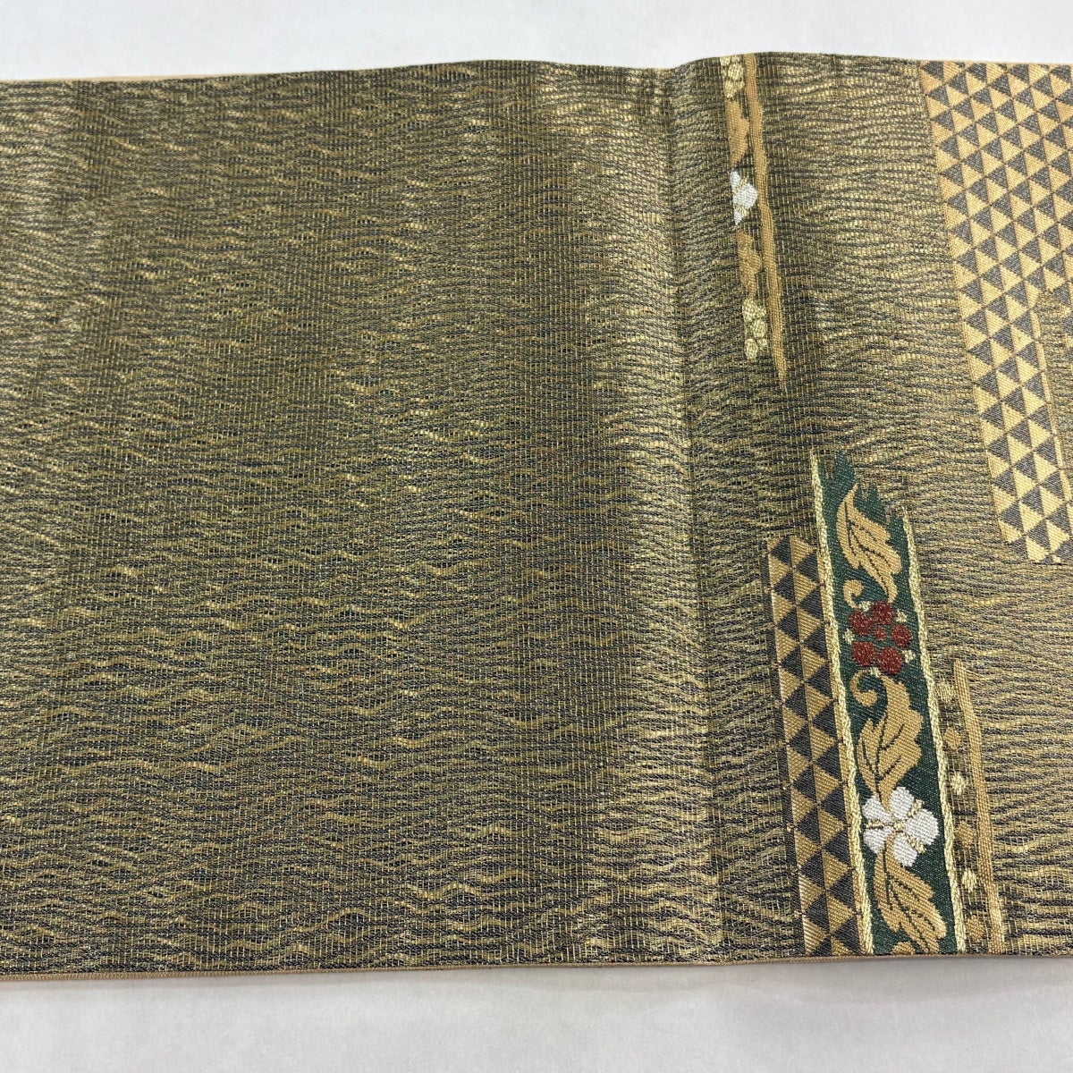 【美品】 袋帯 秀品 華文 草花 金糸 箔 灰緑 六通 正絹
