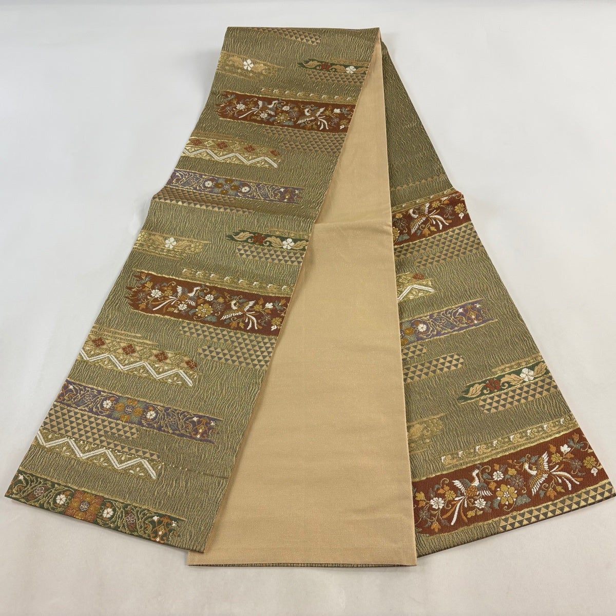 袋帯 秀品 松 鶴 箔 金銀糸 ベージュ 六通 正絹