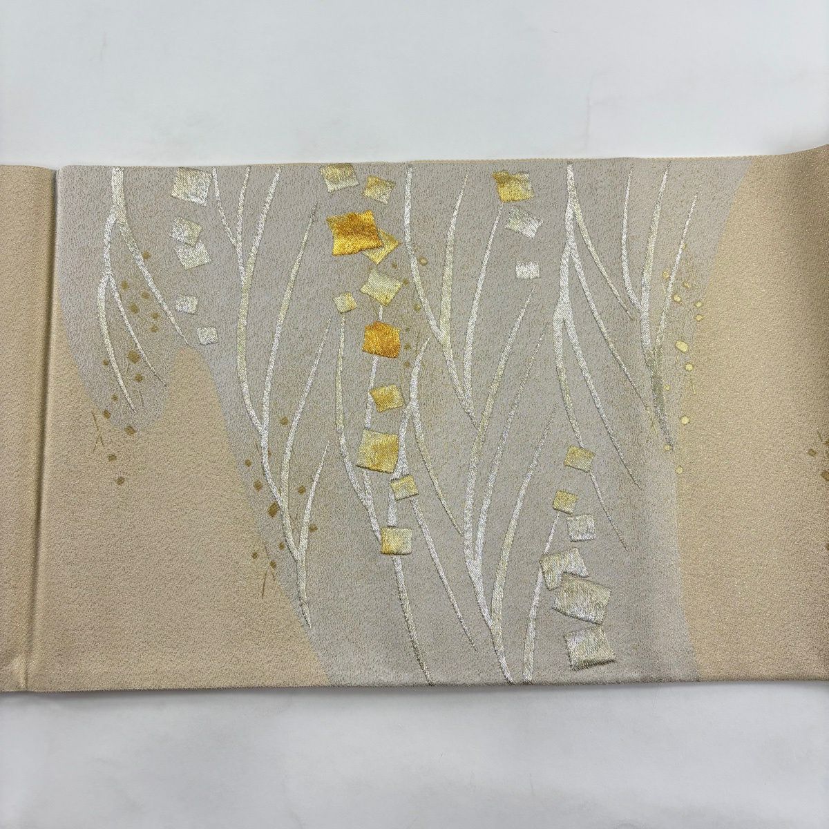 【美品】 袋帯 秀品 熨斗月麗秀文 巻物 草花 金糸 箔 ベージュ 六通 正絹