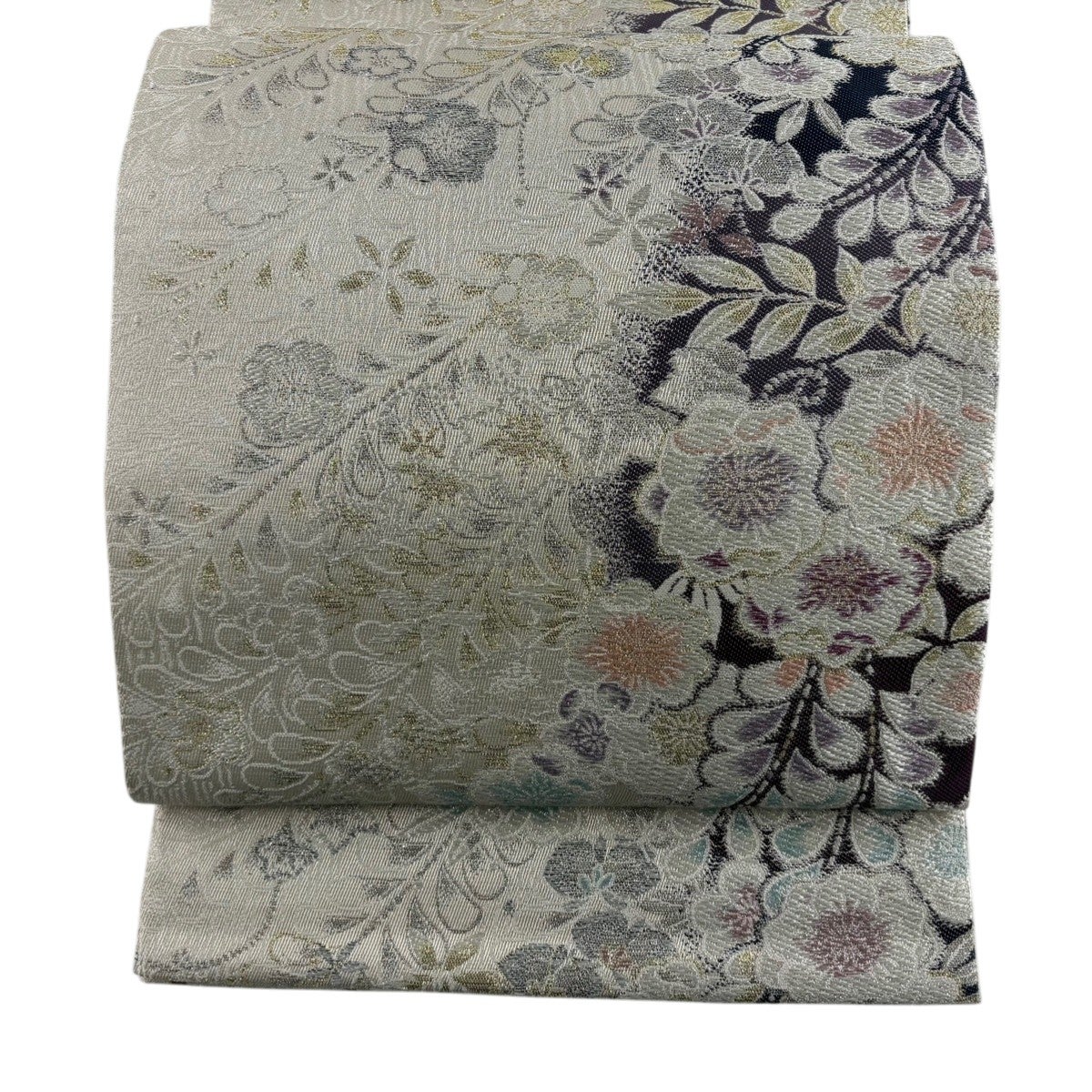 名古屋帯 秀品 夏帯 羅 草花 銀糸 ベージュ 正絹