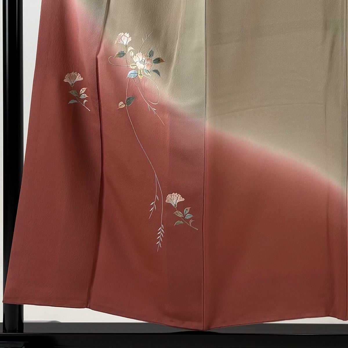 【美品】 付下げ 身丈154cm 裄丈62cm S 袷 椿 草花 刺繍 染分け ベージュ 正絹 秀品
