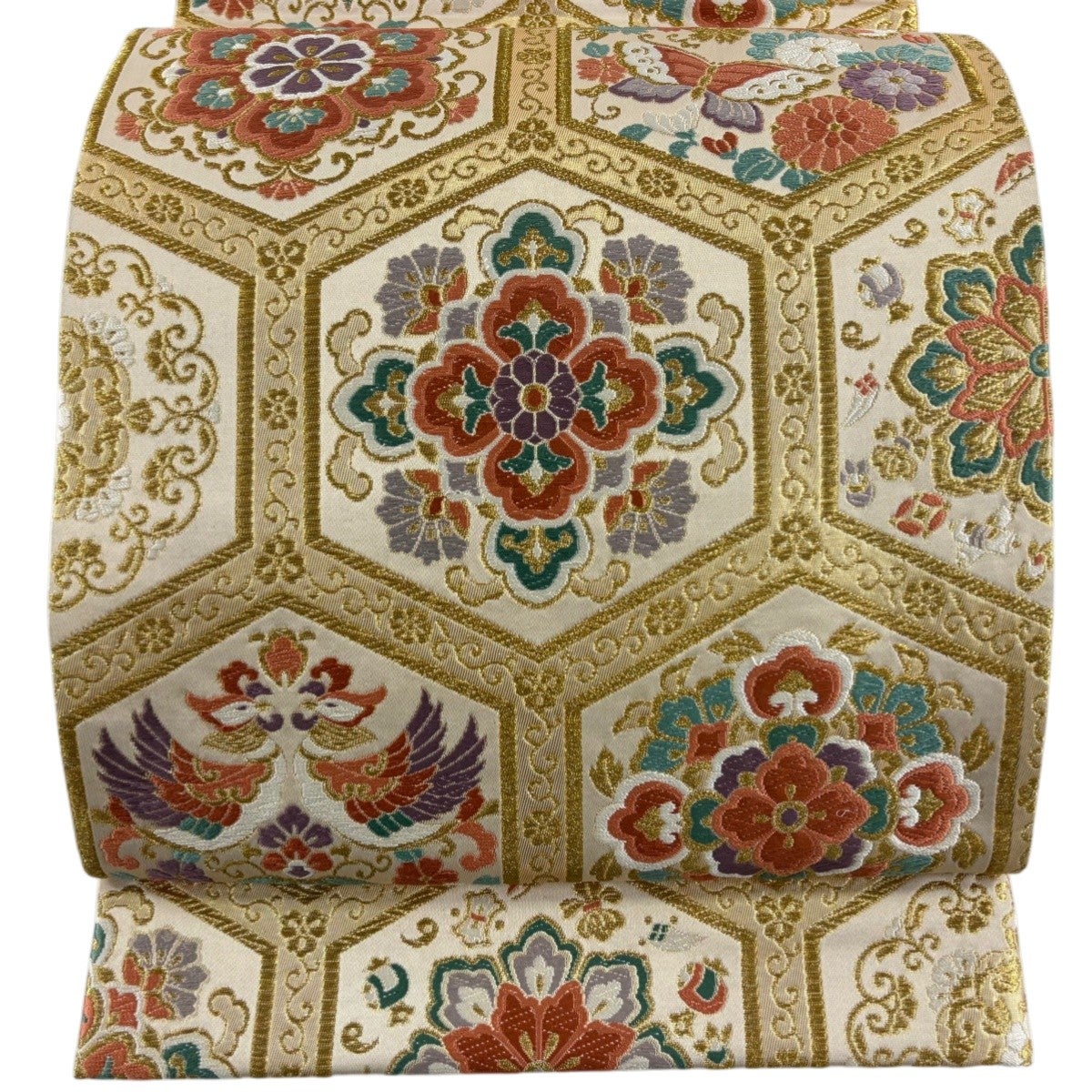 【美品】 袋帯 秀品 振袖向き 花 有職文様 箔 金糸 ベージュ 六通 正絹