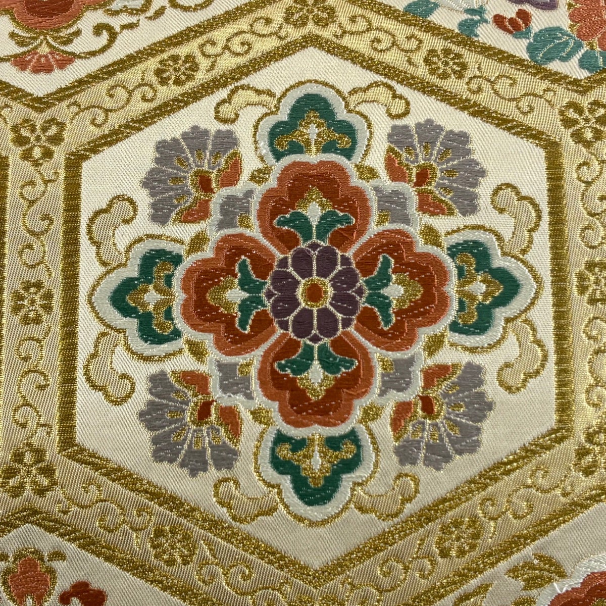 【美品】 袋帯 名品 七宝桐鉄線文 唐織 箔 クリーム 六通 正絹