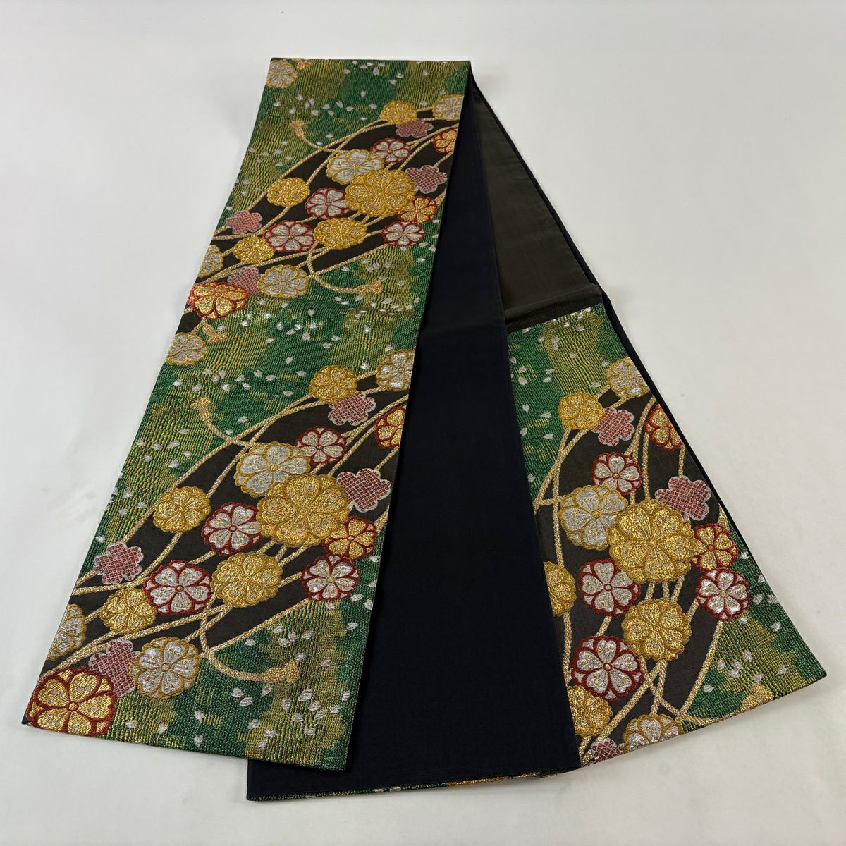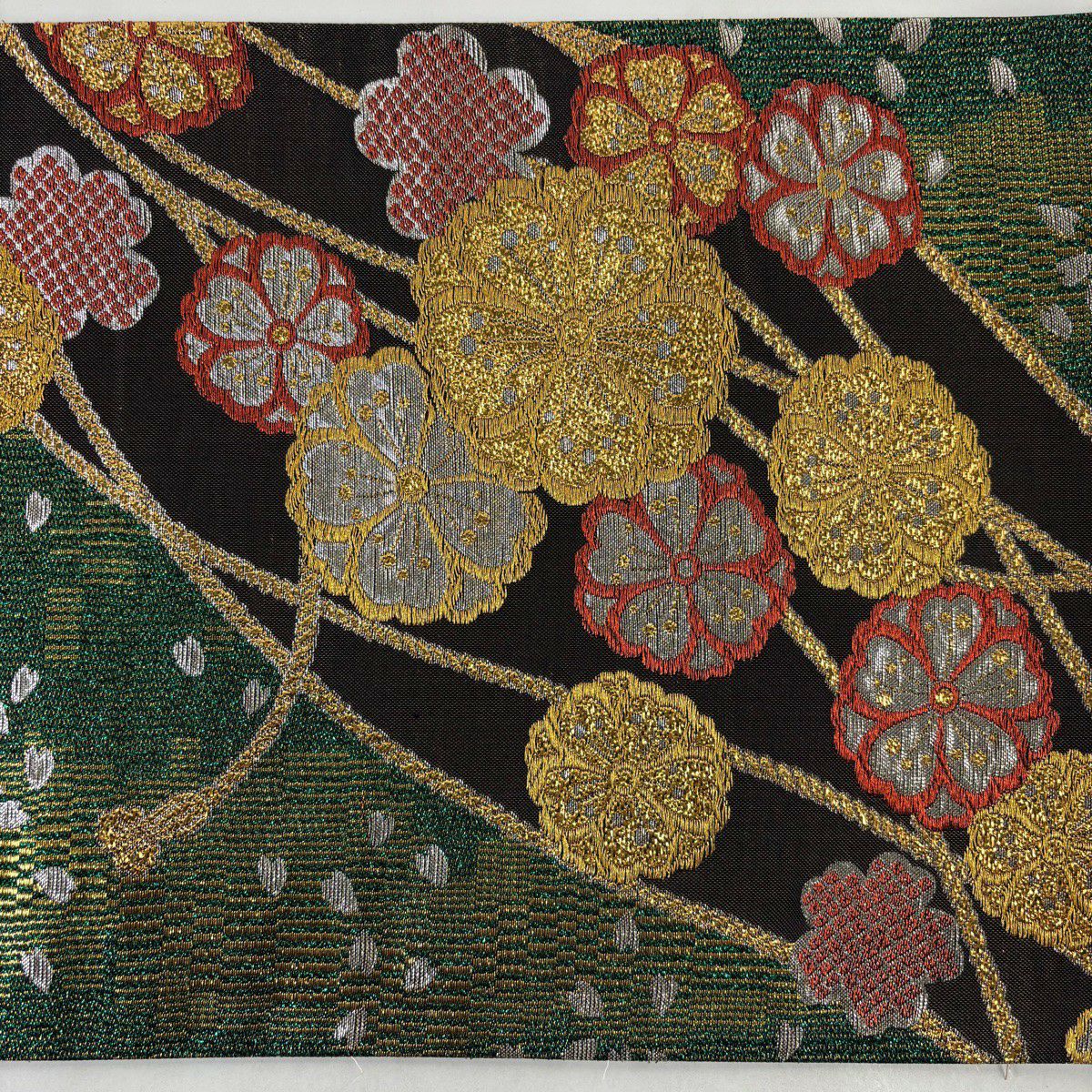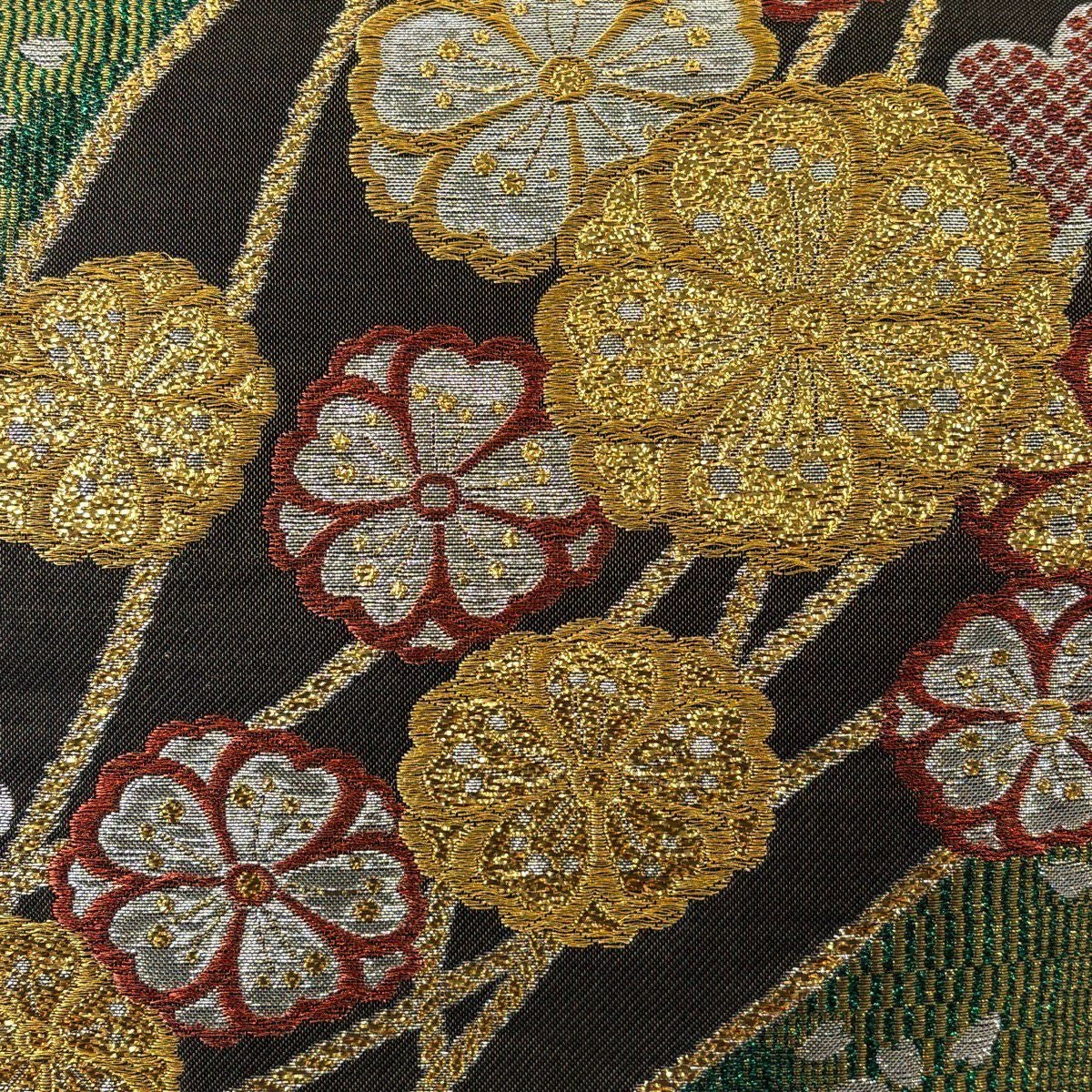 袋帯 秀品 桜 箔 緑 六通 正絹