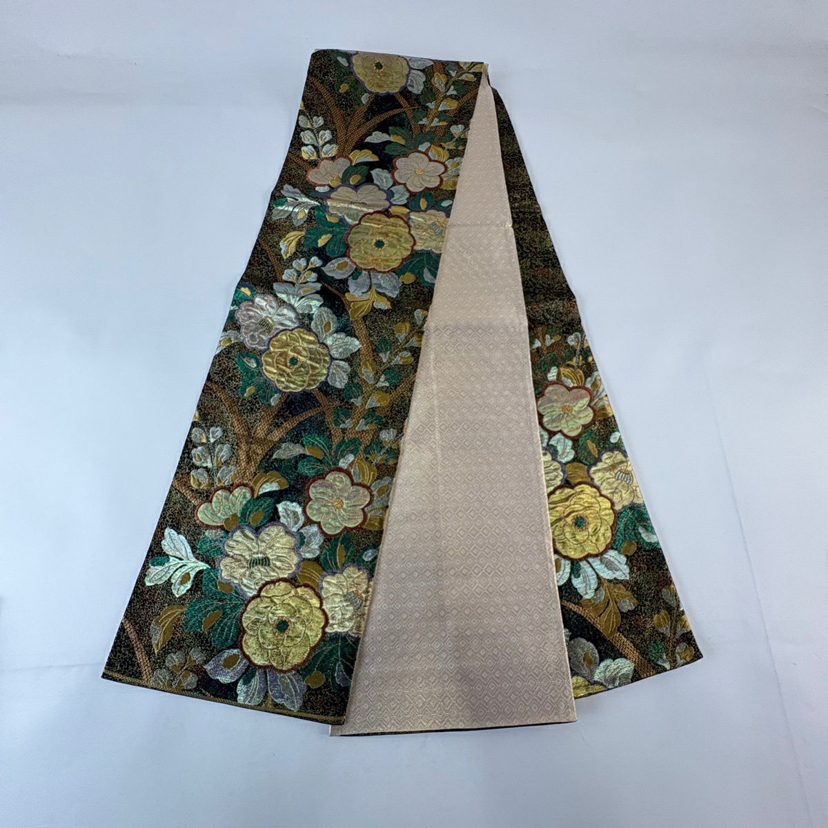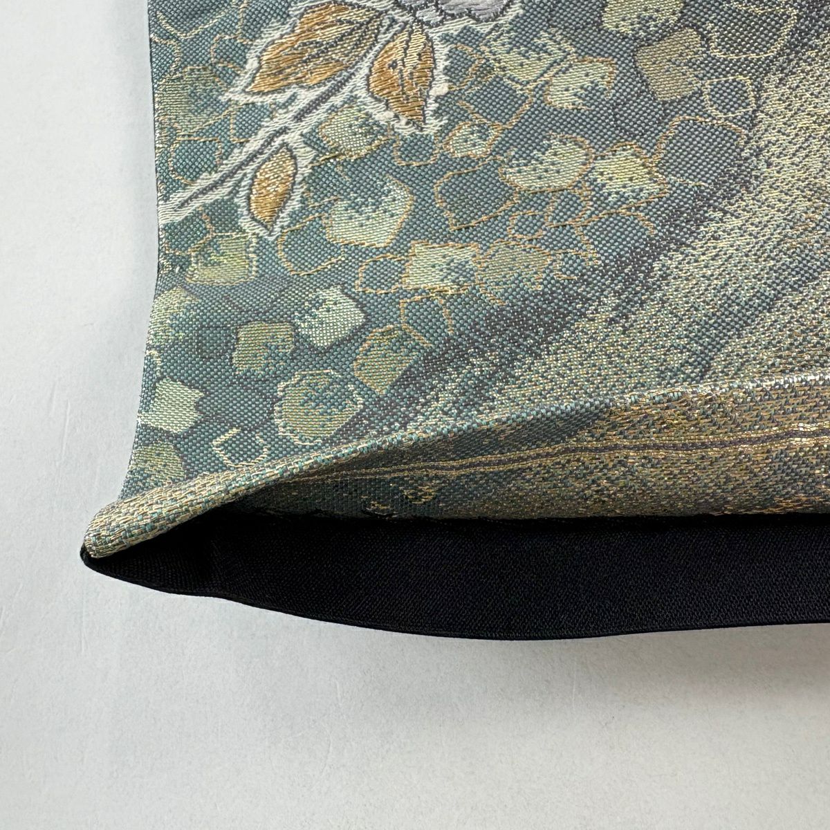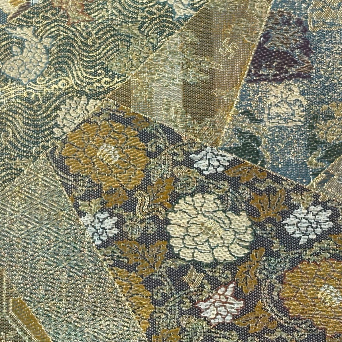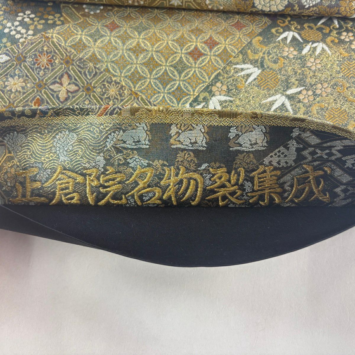 袋帯 秀品 正倉院名物裂集成 花唐草 金糸 箔 灰緑 全通 正絹
