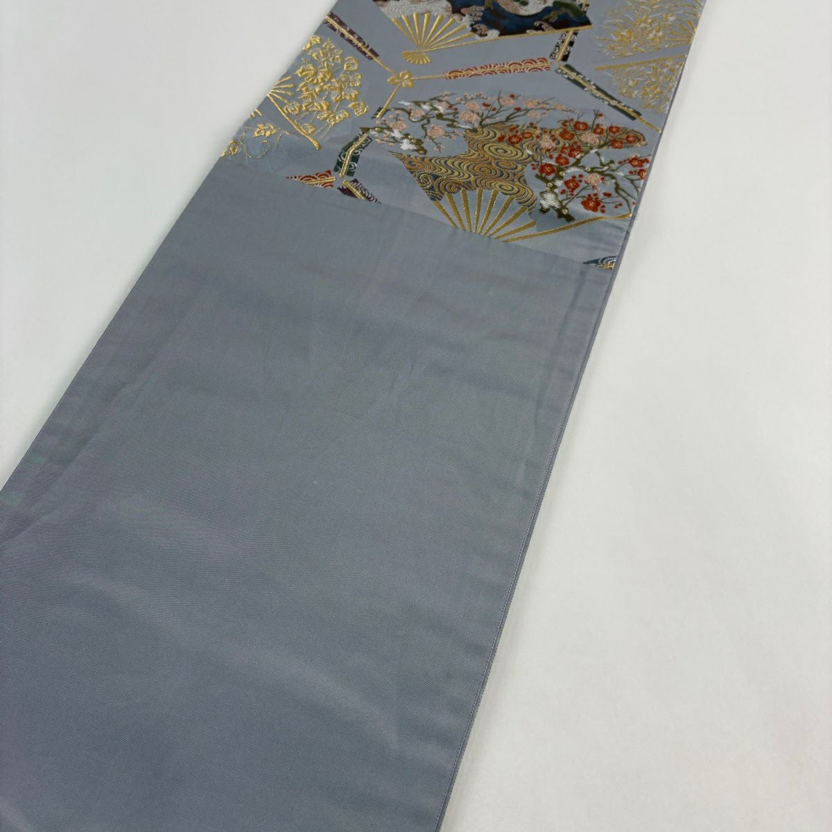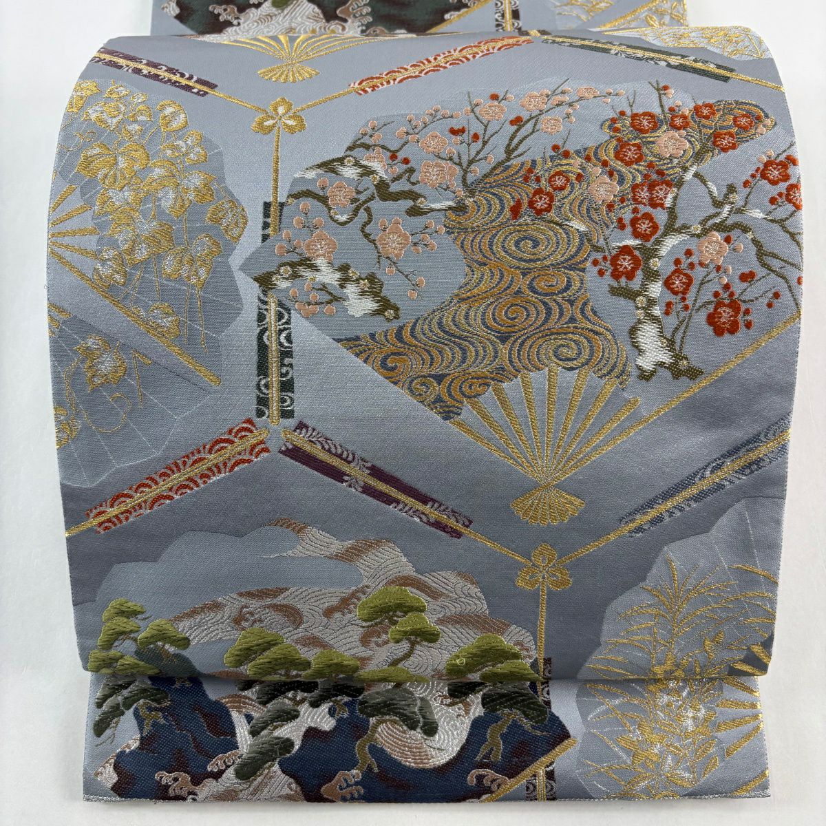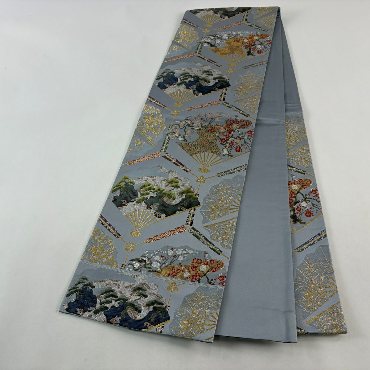 袋帯 秀品 関西仕立て 亀甲 扇 金糸 箔 青灰色 六通 正絹