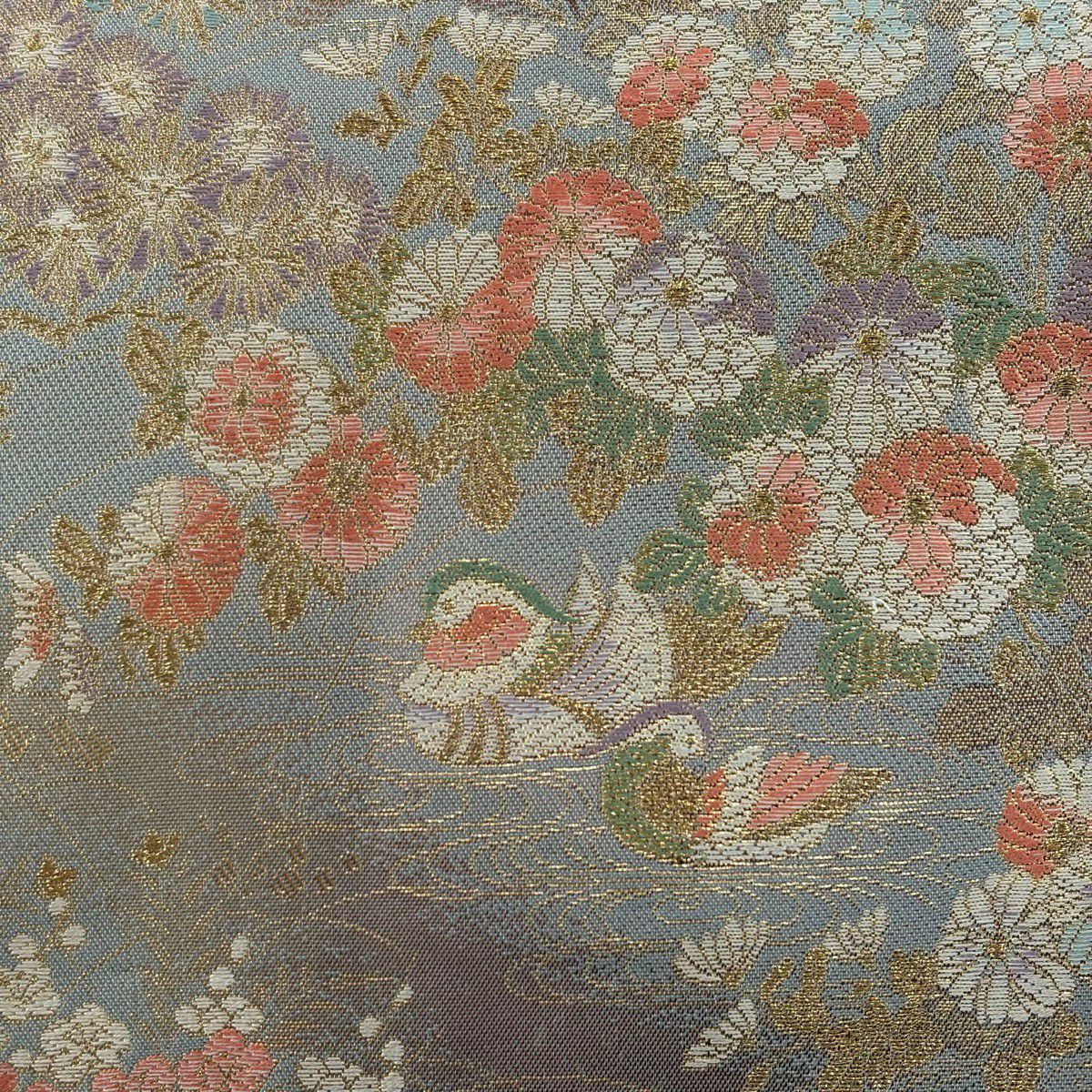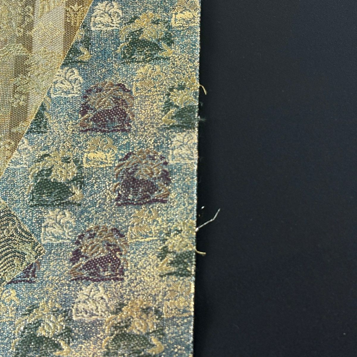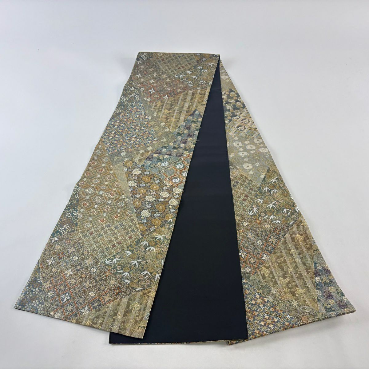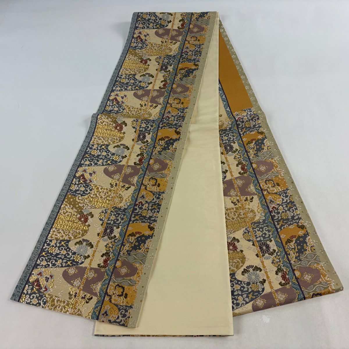 袋帯 秀品 関西仕立て 亀甲 扇 金糸 箔 青灰色 六通 正絹