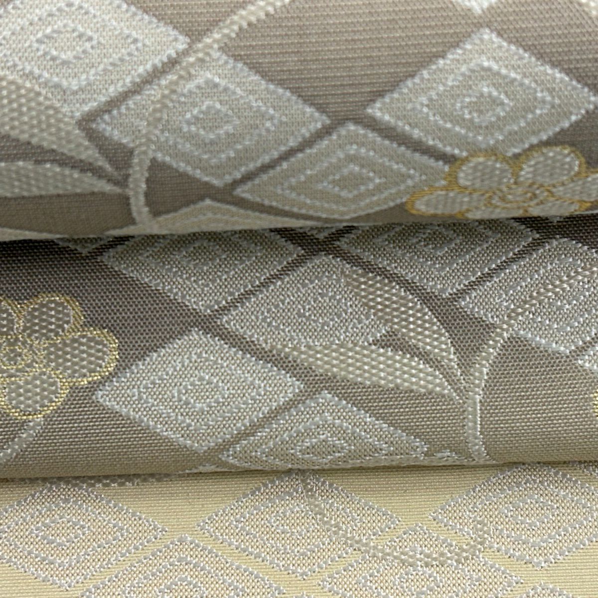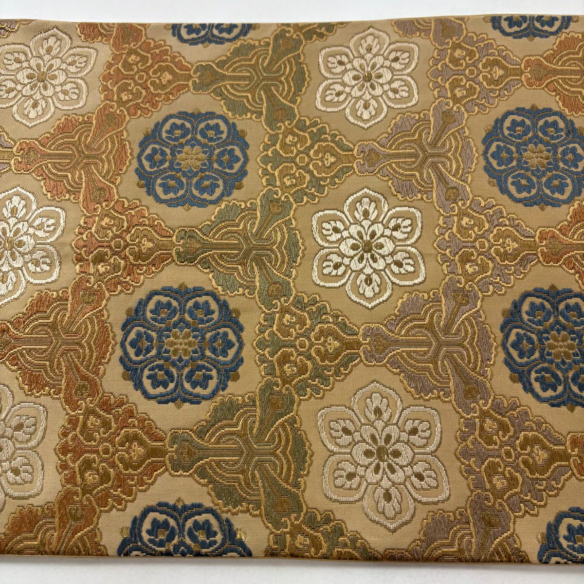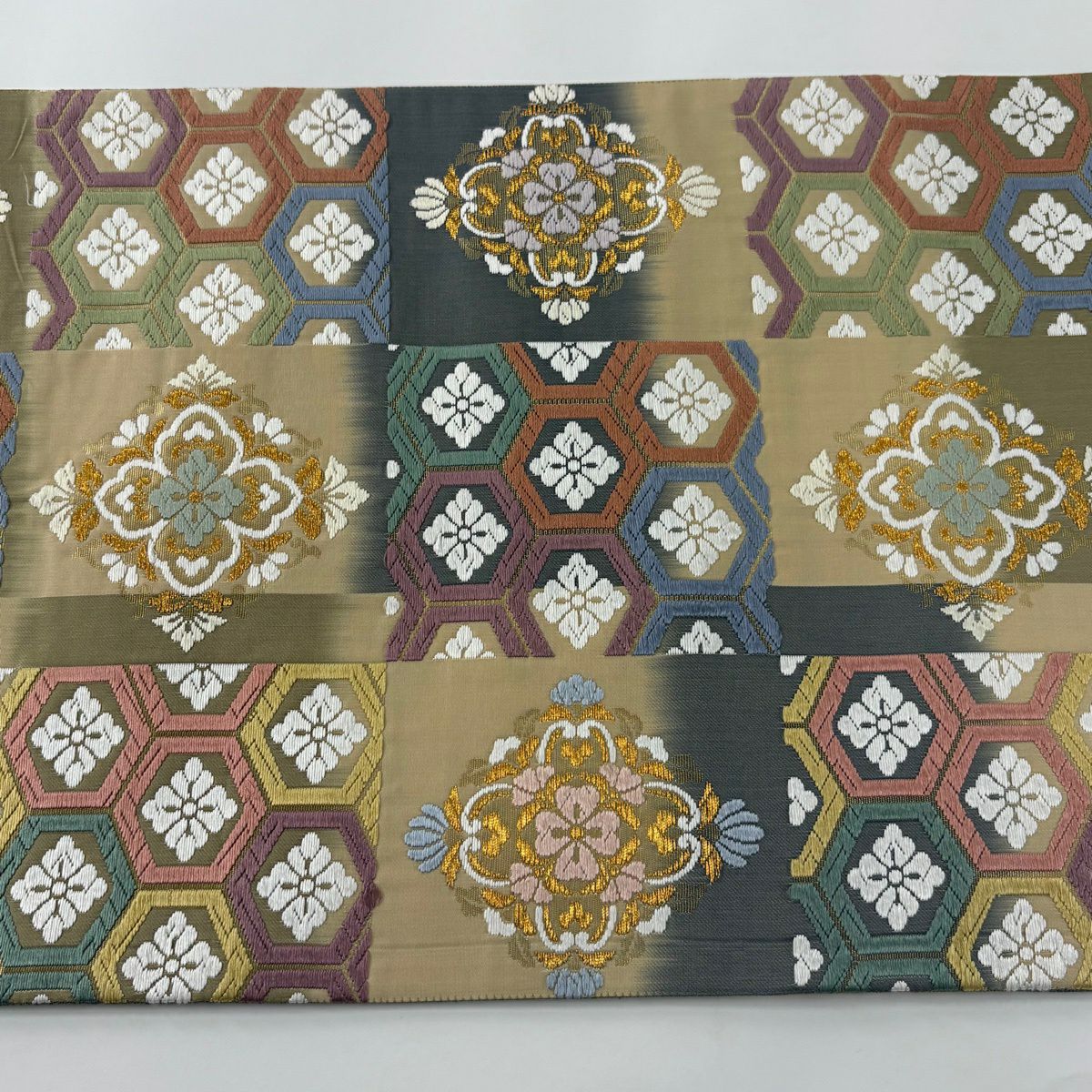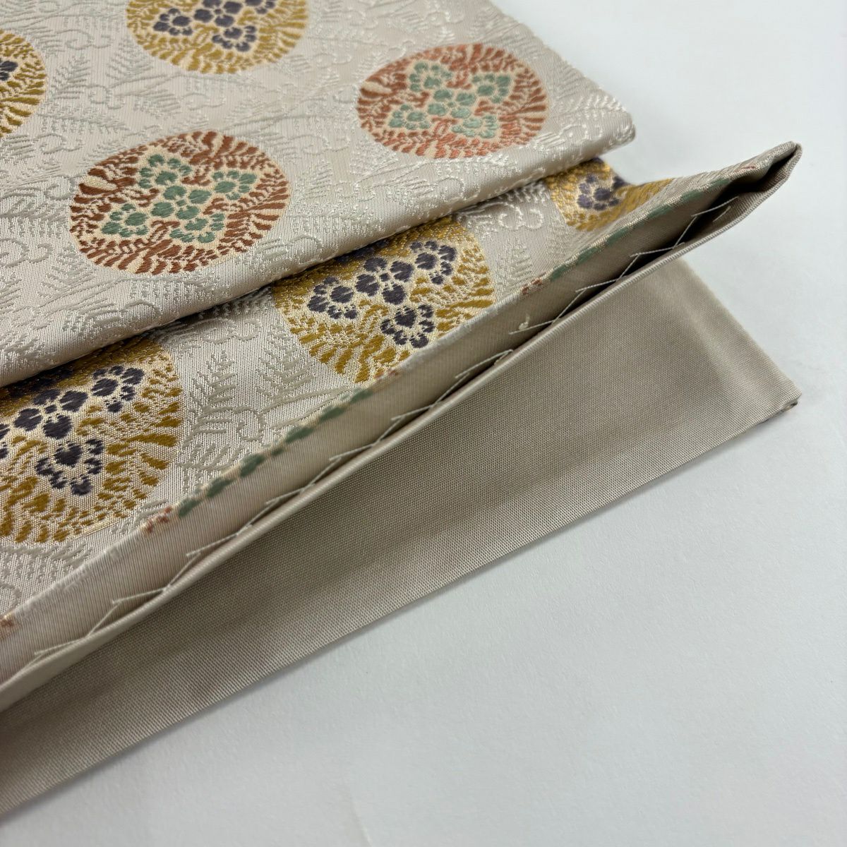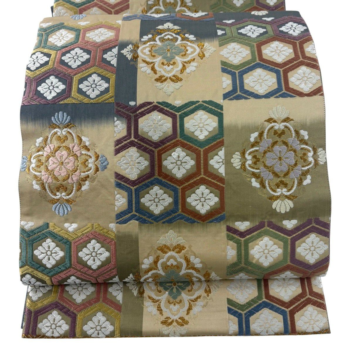 【美品】 袋帯 秀品 花唐草 菱 箔 ベージュ 六通 正絹