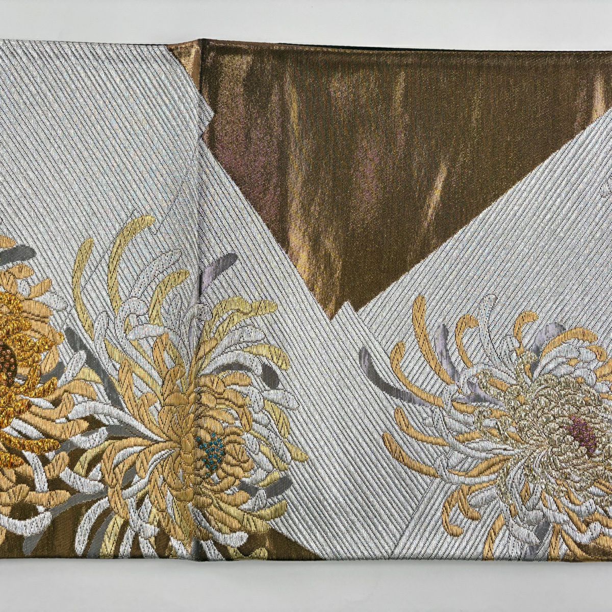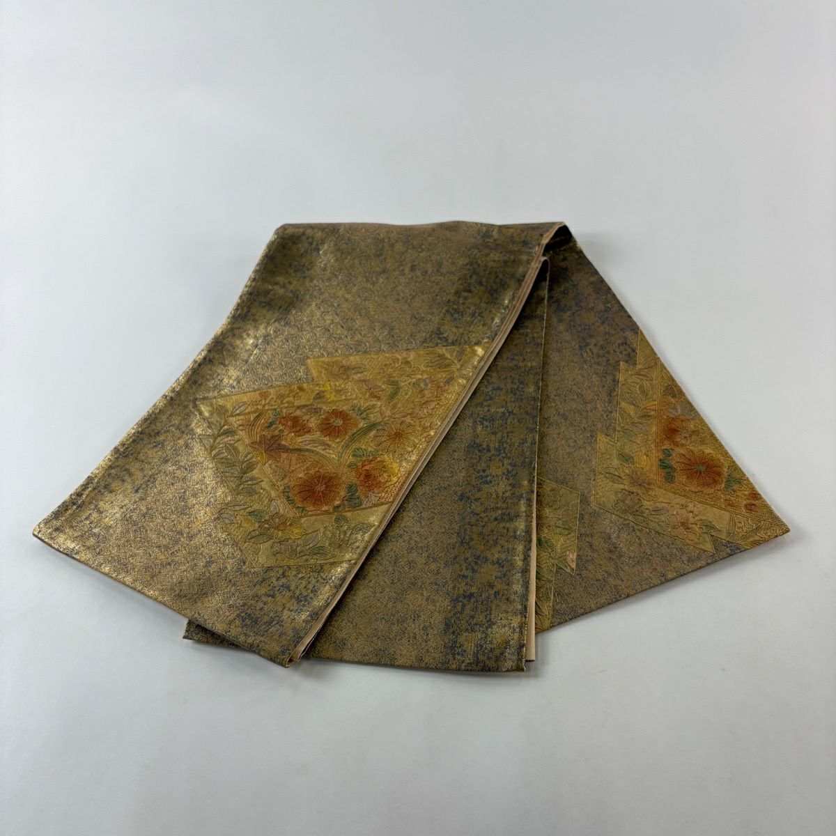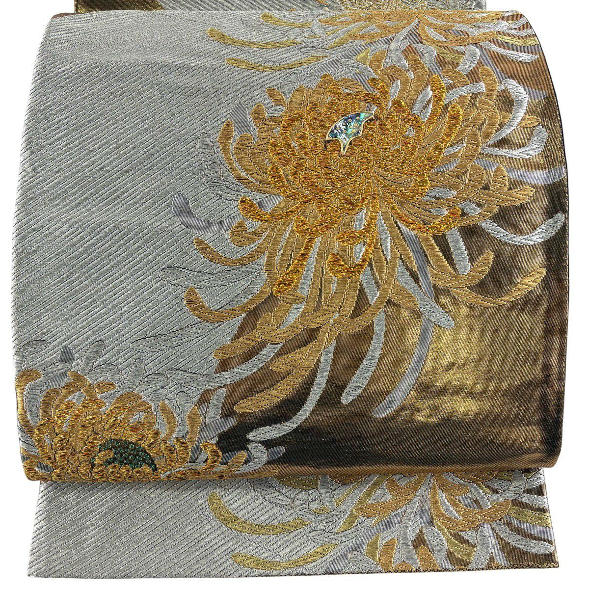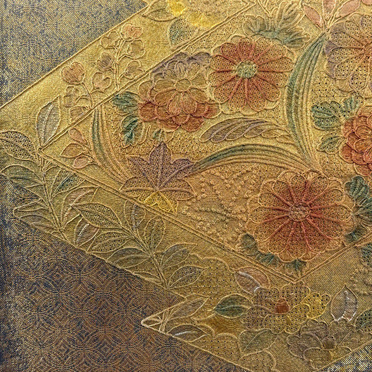 【美品】 袋帯 秀品 草花 菊 刺繍 金彩 金色 お太鼓柄 正絹