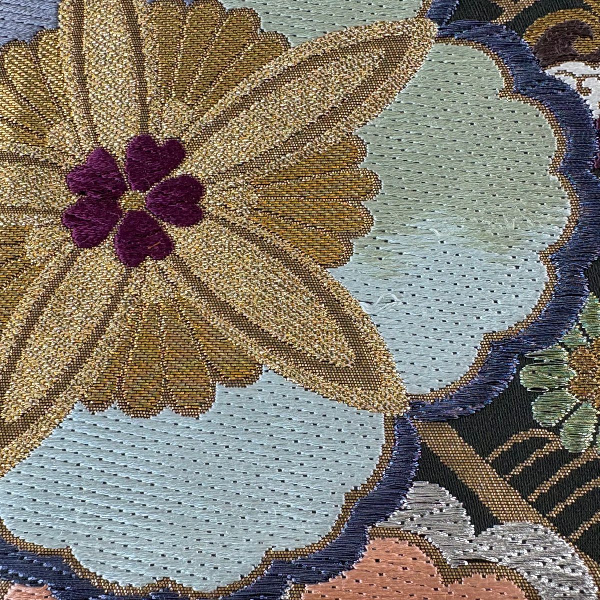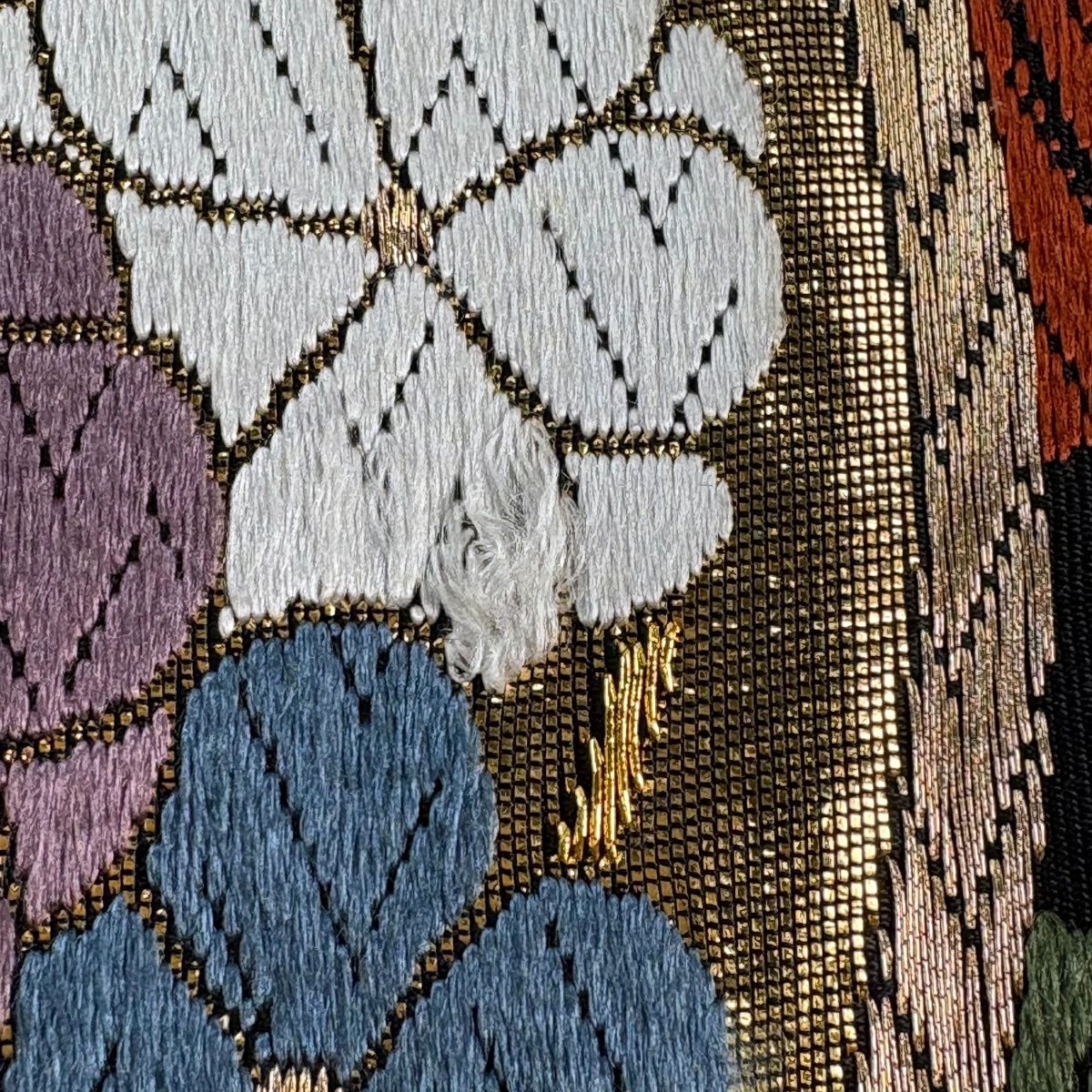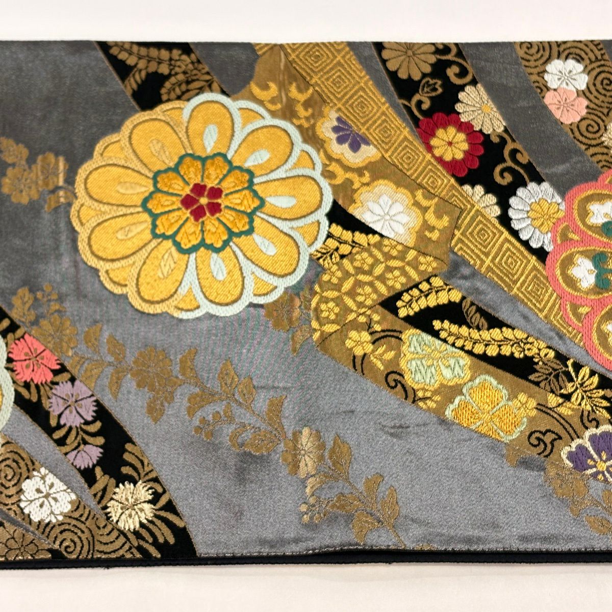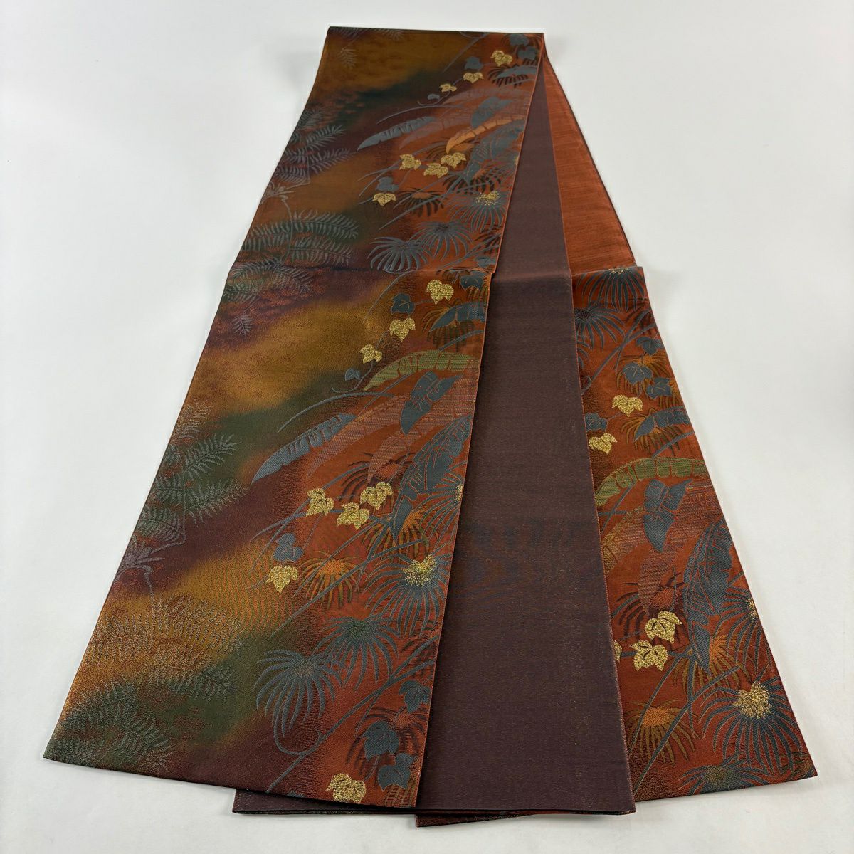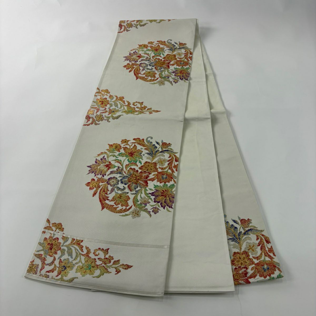 【美品】 袋帯 秀品 草花 菊 刺繍 金彩 金色 お太鼓柄 正絹